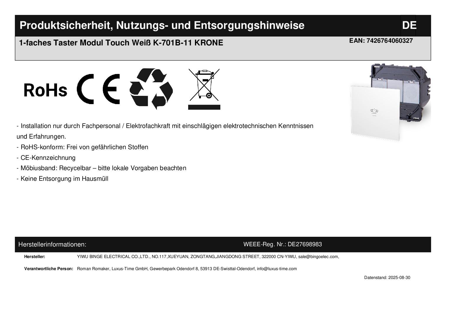 Krone einfaches Touch-Taster-Modul inkl. weißem Touchfeld.Bitte beachten Sie, dass es sich bei diesem Angebot nur um das Touch-Taster-Modul OHNE Glasrahmen handelt. Die Glasabdeckung des Touch-Moduls ist Bestandteil des Lieferumfangs. Bei diesem Produkt handelt es sich um einen Taster und nicht um einen Lichtschalter . Für die Verwendung eines Tasters als Schalter ist zwingend ein Relais notwendig. Anders als ein Schalter sendet der Taster nur einen kurzen Impuls und würde so z. B. das Licht nur solange eingeschaltet lassen wie der Taster betätigt wird. Einfache und schnelle Montage, sowohl vertikal als auch horizontal . Alle Touch-Schalter sind beleuchtet . Wenn die angeschlossene Leuchte ausgeschaltet ist, leuchtet der Schalter schwach blau, wenn die Leuchte eingeschaltet ist, leuchtet der Schalter in einem stärkeren Blau. Der Austausch erfolgt wie bei anderen Wipp-Schalter-Herstellern. Ersetzen Sie einfach Ihre alten Wipp-Schalter durch ein neues, langlebiges Design. Die Lichtschalter- und Steckdosen-Module sind für Unterputzdosen mit 60 mm Durchmesser geeignet . Die Module werden mittels der den Glasblenden beiliegenden Metallrahmen durch Schrauben an den Unterputzdosen befestigt. Bei uns erhalten Sie die komplette Krone Bandbreite; von einem einfachen Wipp-Lichtschalter bis zum smarthome-fähigen Touch-Lichtschalter. Hinweis zur Installation: Taster stromlos anschließen. Glasblende aufsetzen. Wichtig!!! Strom erst einschalten, wenn die Glasblende aufgesetzt wurde. Sollte dieser Hinweis nicht beachtet werden, kann es vorkommen, dass der Taster nicht reagiert. Fragen? Rufen Sie uns an oder senden Sie uns eine E-Mail. Wir beraten Sie gerne! Technische Daten:Abmessungen: 48 mm x 48 mm x 25 mm Betriebsspannung: AC110 ~ 250V, 50Hz60Hz max. Stromzufuhr für jeden Gang 2.5 A max. Leistung für jeden Gang: 800W Ruhestromverbrauch: weniger als 0,1mW Lebensdauer: 100.000 Benutzungen Montage in Standard UP-Dose mit Durchmesser von 60mm mit Schraubgewinde Herstellerangaben:YIWU BINGE ELECTRICAL CO.,LTD.