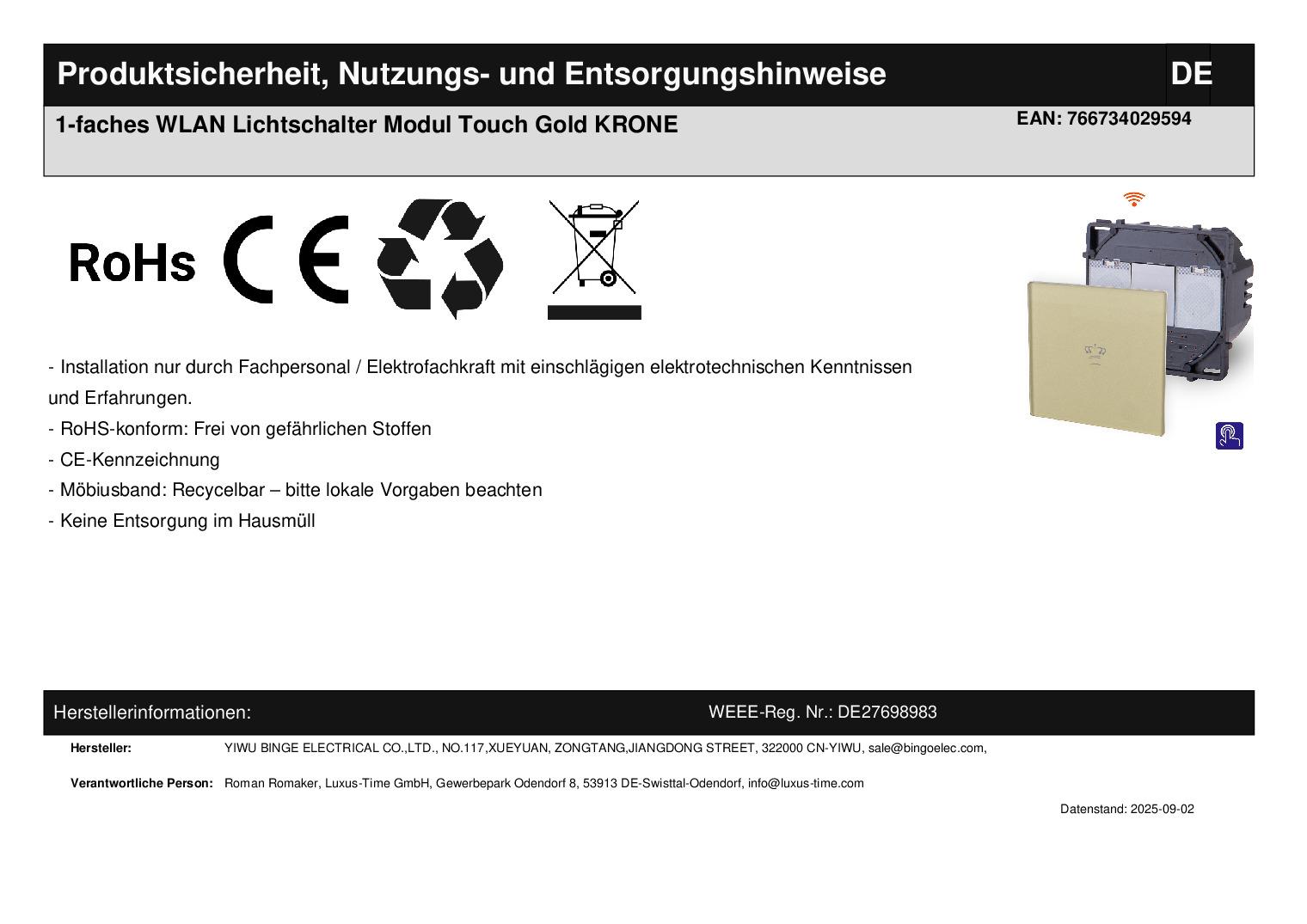 Titel: 1-faches WLAN Lichtschalter Modul Touch Gold KRONE