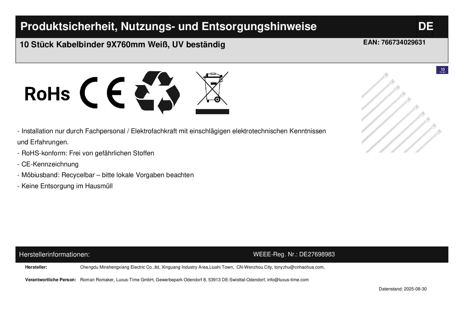 10 Stück Kabelbinder 9X760mm Weiß, UV beständig