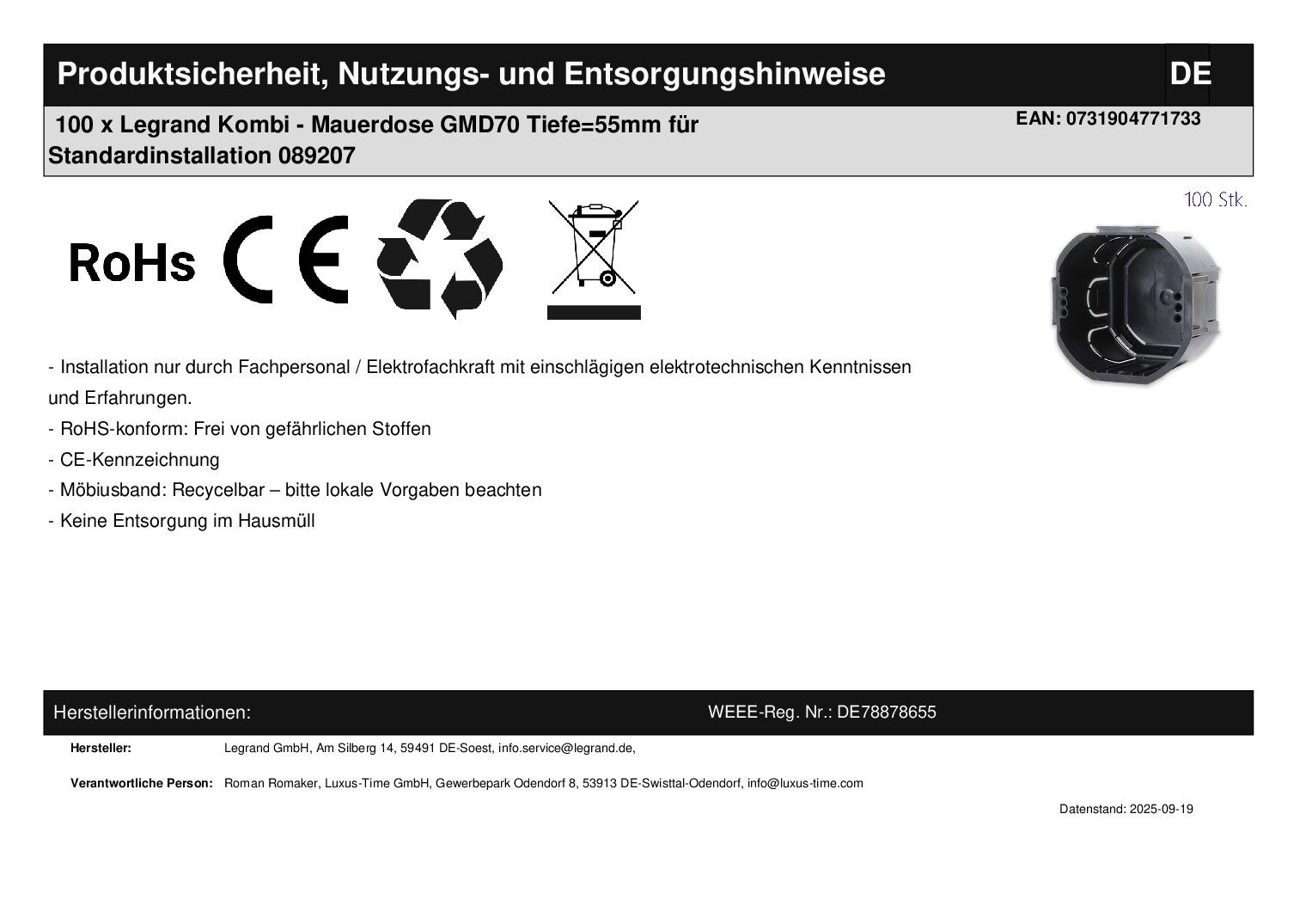 Titel: | 100 x Legrand Kombi - Mauerdose GMD70 Tiefe=55mm für Standardinstallation 089207 |