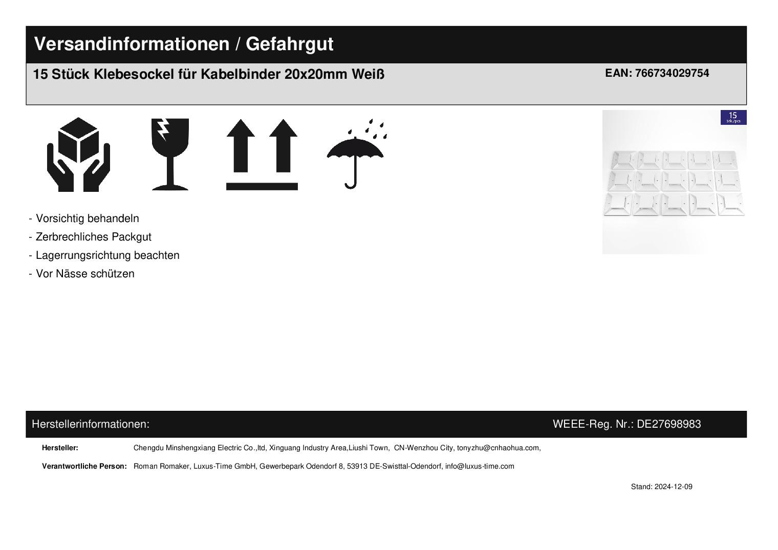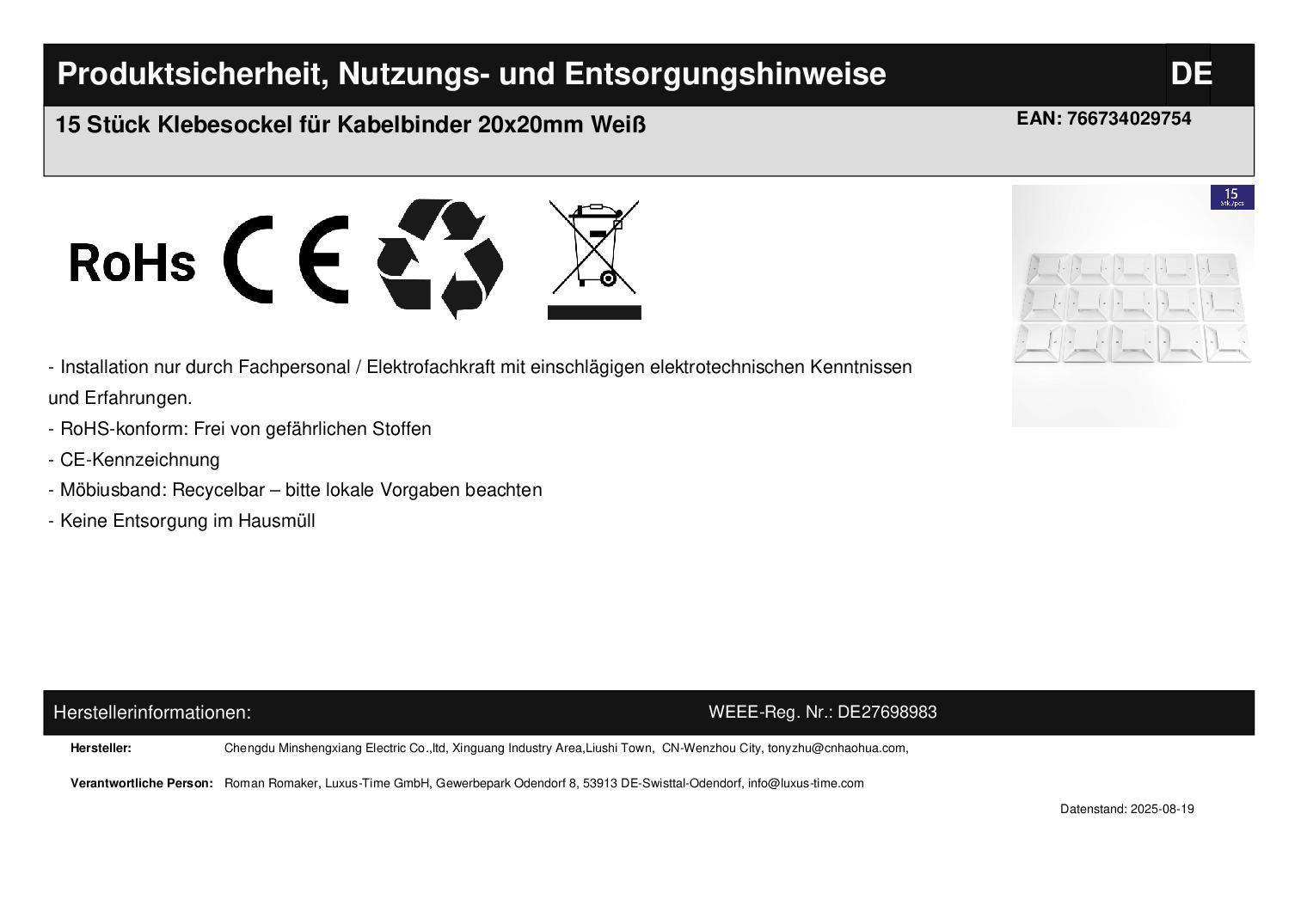 Diese Klebesockel können dafür verwendet werden, mit Kabelbindern gebündelte Kabel oder sonstige Objekte an denen Kabelbinder befestigt wurden, an flachen Oberflächen anzubringen. Herstellerangaben:Chengdu Minshengxiang Electric Co.,ltd