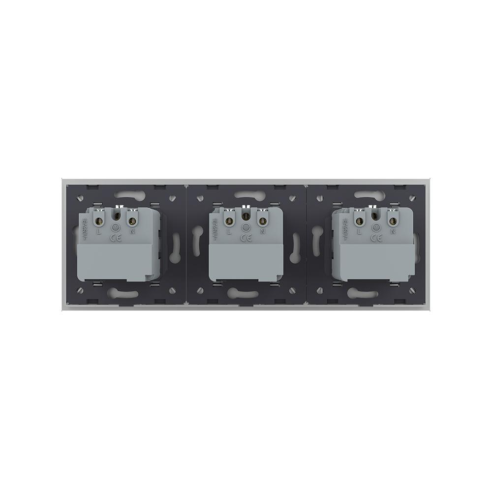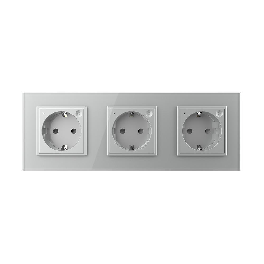 Livolo EC Steckdosen-Module mit 3-Fach Glasrahmen in Grau Die Livolo EC Steckdose ermöglicht es Ihnen zusammen mit dem Livolo EC Gateway, die Geräte, die an die Steckdose angeschlossen werden, per App zu steuern oder eine Routine zu hinterlegen. Durch die Livolo Home App kann die Steckdose von überall gesteuert werden. Auch die Sprachsteuerung über Google Home oder Amazon Alexa ist möglich. Bitte beachten Sie, dass die Livolo EC Produkte nur mit dem Livolo EC Gateway genutzt werden können. Mit ein paar Klicks in der App können Sie z. B. festlegen, dass die Kaffeemaschine jeden Morgen zu einer bestimmten Uhrzeit angeschaltet wird. In Kombination mit der passenden Glasblende wird diese Steckdose zu einem echten Hingucker. Einfache und schnelle Montage, sowohl vertikal als auch horizontal . In unserem Shop finden Sie auch Spreizkrallen (LG-01) im 2er Pack, für Unterputzdosen ohne Verschraubungsmöglichkeit. Geeignet für Hohlwände und ältere Häuser (Baujahr vor 1970). Bei Verwendung von Spreizkrallen sind 68 mm große Unterputzdosen besser geeignet. Die Module werden mittels der beiliegenden Metallrahmen durch Schrauben an den Unterputzdosen befestigt. Der Austausch erfolgt wie bei anderen Steckdosen-Herstellern. Ersetzen Sie einfach Ihre alten Steckdosen durch ein neues, langlebiges Design. Die Verkabelung bleibt die gleiche. Die Lichtschalter- und Steckdosen-Module sind für Unterputzdosen mit 60-68 mm Durchmesser geeignet . Der Lochabstand für Mehrfach-Blenden beträgt 71 mm. Bei uns erhalten Sie die komplette Livolo Bandbreite; von einem einfachen Wipp-Lichtschalter bis zum smarthome-fähigen Touch-Rollladenschalter. Technische Daten: Betriebsspannung: 100-250V Stromspannung: 50/60Hz 16A Entfernung: max. innen 10m, freie Fläche 20m Schutzart: IP 20 Lebensdauer: über 50000 Male Abmessungen: 222 mm x 80 mm x 45 mm Lieferumfang: Im Lieferumfang enthalten ist: