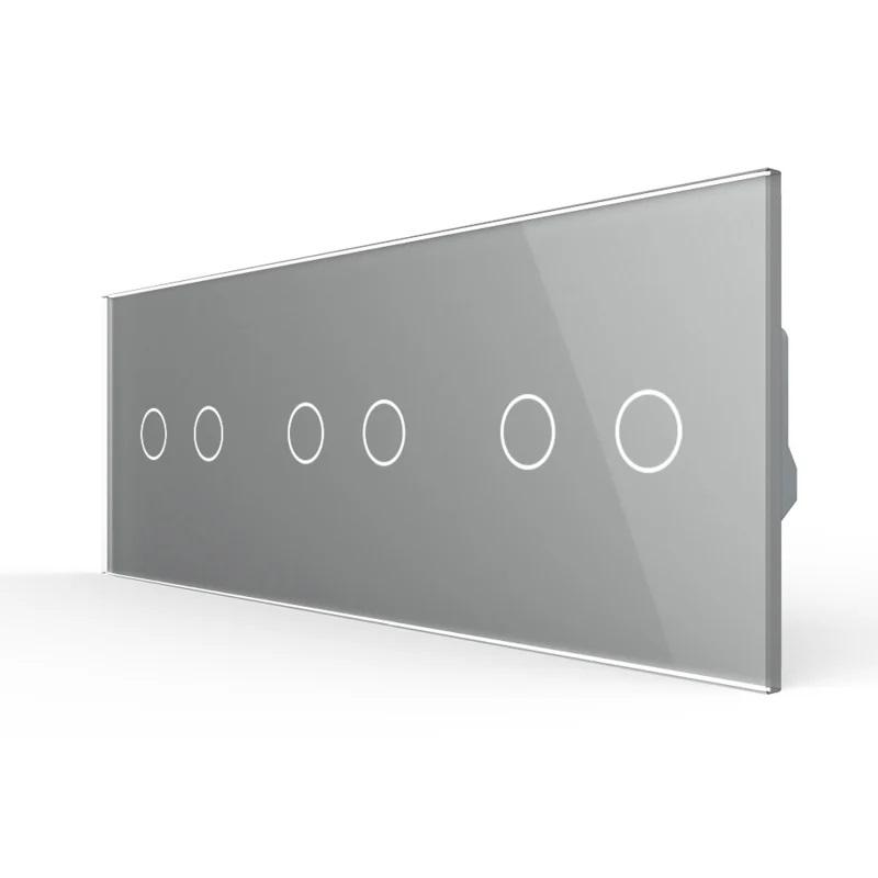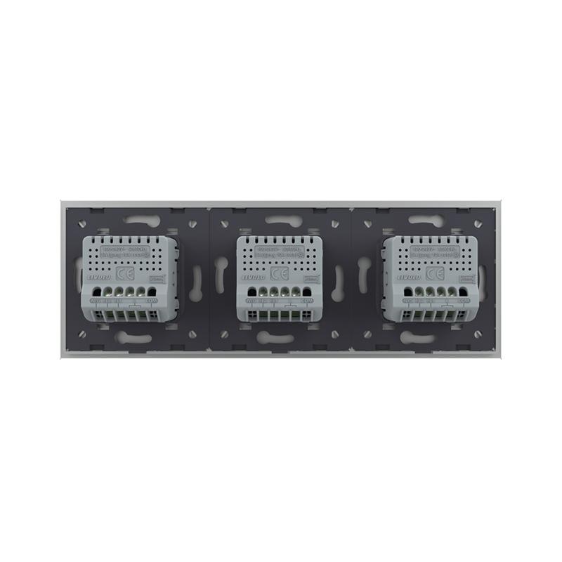 Livolo 3 EC-Rollladenschalter mit zweifacher Glasblende in Grau Dies sind drei Livolo EC-Rollladenschalter, zum hoch- und runterfahren sowie pausieren jeweils eines Rollladen, einer Markise, eines Raffstores oder einer Jalousie. Die EC-Funktion ermöglicht die Steuerung auch per App (Livolo App), wenn Sie das Livolo EC Gateway verwenden. Über die App ist auch das Festlegen eines Zeitplans möglich. Durch die Kombination mit der passenden Glasblende werden diese Schalter mit moderner Sensortechnik zu einem echten Hingucker. Einfache und schnelle Montage, sowohl vertikal als auch horizontal . Durch leichtes Berühren der Kreisfläche wird der Rollladenschalter betätigt. Die Kontur der Berührungsfläche ist dezent beleuchtet , so dass eine einfache Bedienung zu jeder Tageszeit möglich ist. Vor allem im Dunkeln ist es einfach den Schalter zu finden. Im An-Modus leuchtet die Umrandung des Touchfeldes Rot, im Aus-Modus Blau. Durch ein weiteres Betätigen des Schalters können Sie den Rollladenmotor stoppen. In unserem Shop finden Sie auch Spreizkrallen (LG-01) im 2er Pack, für Unterputzdosen ohne Verschraubungsmöglichkeit. Geeignet für Hohlwände und ältere Häuser (Baujahr vor 1970). Bei Verwendung von Spreizkrallen sind 68 mm große Unterputzdosen besser geeignet. Die Module werden mittels der beiliegenden Metallrahmen durch Schrauben an den Unterputzdosen befestigt. Der Austausch erfolgt wie bei anderen Wipp-Schalter-Herstellern. Ersetzen Sie einfach Ihre alten Wipp-Schalter durch ein neues, langlebiges Design. Die Verkabelung bleibt die gleiche. Die Lichtschalter- und Steckdosen-Module sind für Unterputzdosen mit 60-68 mm Durchmesser geeignet . Der Lochabstand für Mehrfach-Blenden beträgt 71 mm. Bei uns erhalten Sie die komplette Livolo Bandbreite; von einem einfachen Wipp-Lichtschalter bis zum smarthome-fähigen Touch-Rollladenschalter. Fragen? Rufen Sie uns an oder senden Sie uns eine E-Mail. Wir beraten Sie gerne! Technische Daten: Betriebsspannung: AC 220V-250V Stromstärke: 5A Stromlast: 2000W Lebensdauer über 100.000 Male Abmessungen:222 x 80 x 34 mm Lieferumfang: Im Lieferumfang enthalten ist: - 3 x Livolo Innenleben Touch-Schalter, gemäß Bestellung - 1 x Livolo Glasblende, gemäß Bestellung - Bedienungsanleitung Info zur Installation: der Anschluss erfolgt OHNE Strom und Glasblende, nach der Montage können Sie die Glasblende aufsetzten und den Strom wieder einschalten. Lassen Sie dem Touch Schalter, vor dem betätigen 3 Minuten ruhen. Nach Ablauf der Zeit kann der Rollladenschalter betätigt werden. Sollten Sie diese Hinweise nicht befolgen, kann es vorkommen dass der Rollladenschalter nicht reagiert.