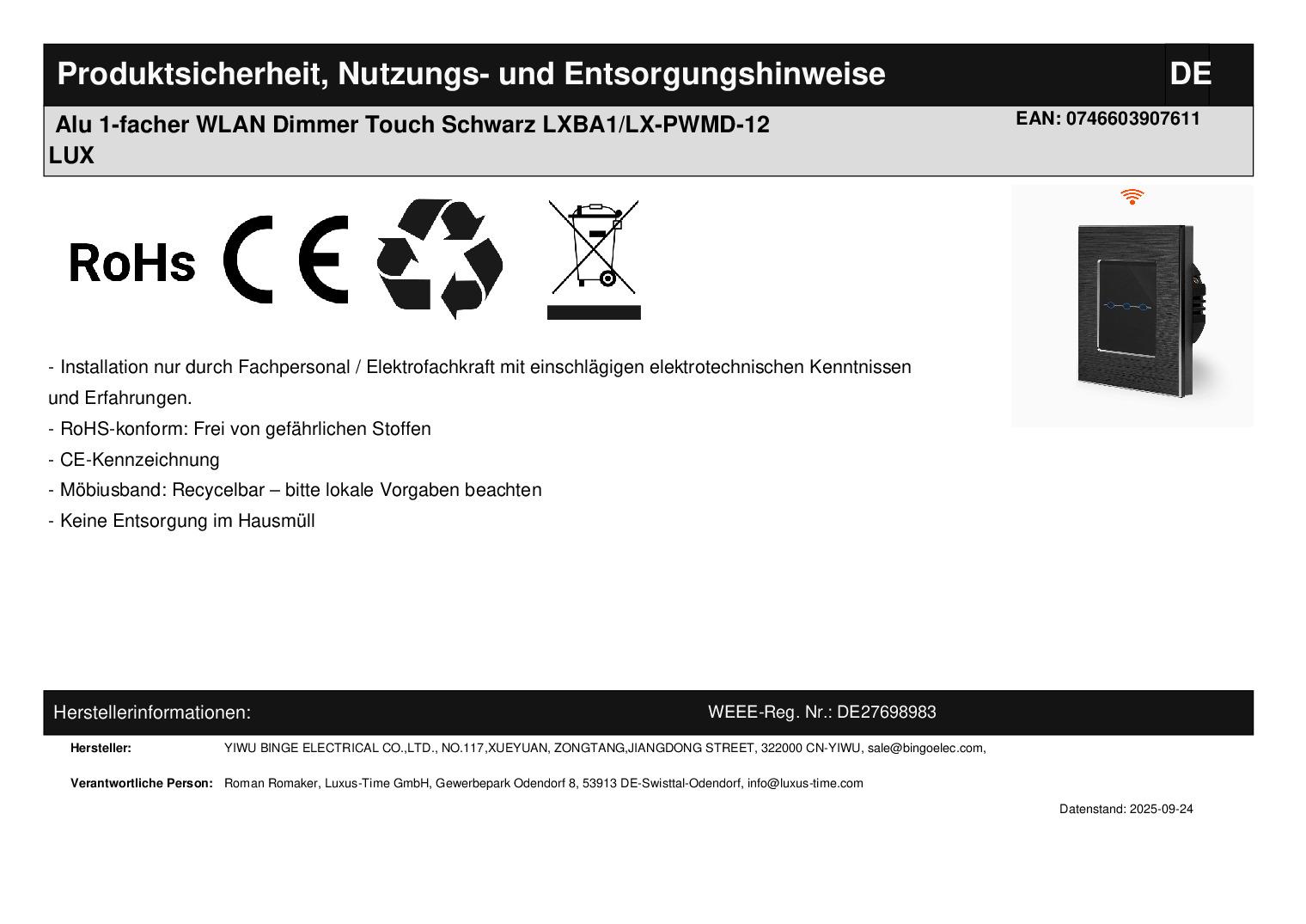 Dieser Artikel besteht aus einem schwarzen, einfachen Alurahmen, sowie einem schwarzen WLAN-Touch-Dimmer-Modul.