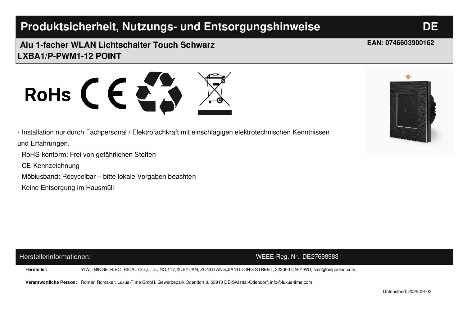 Dieser Artikel besteht aus einem schwarzen, einfachen Aluminiumrahmen, sowie einem schwarzen Touch-Schalter-Modul.Dies ist ein POINT Touch-WLAN-Lichtschalter zum einfachen ein- und auszuschalten von einer Leuchte. Zusätzlich verfügt dieser Schalter auch über eine WLAN-Funktion, sodass Sie den Schalter auch mit Ihrem Smartphone steuern können. Dazu können Sie die Tuya App, Amazon Alexa, Google Home oder IFTT verwenden. Zusätzlich kann der Schalter über die Tuya App als Wechselschalter definiert werden. Für die Verwendung der WLAN-Schalter ist ein Neutral- bzw. Null-Leiter notwendig. Einfache und schnelle Montage, sowohl vertikal als auch horizontal . Alle Touch-Schalter sind beleuchtet . Wenn die angeschlossene Leuchte ausgeschaltet ist, leuchtet der Schalter schwach blau, wenn die Leuchte eingeschaltet ist, leuchtet der Schalter in einem stärkeren Blau. Die Touch-Schalter sind mit allen Arten von Leuchten verwendbar (Halogen, LED, Energiesparlampen), außer LED-Strips . Bei LED-Strips ist die Watt-Zahl in den meisten Fällen zu gering und kann dadurch zu Problemen führen. Steuern Sie Ihre Tuya fähigen Produkte wie z. B. Lichtschalter, Kameras, Raumthermostate, etc. über unseren Smarten Touch Monitor. Sie können über den Monitor Szenen hinterlegen, Ihre Schalter steuern, Ihn als Tür Videotürsprechanlage nutzen oder als Schnittstelle für Zigbee und Amazon Alexa verwenden, wodurch die Nutzung eines Amazon Echos entfallen kann. Der Austausch erfolgt wie bei anderen Wipp-Schalter-Herstellern. Ersetzen Sie einfach Ihre alten Wipp-Schalter durch ein neues, langlebiges Design. Die Lichtschalter- und Steckdosen-Module sind für Unterputzdosen mit 60 mm Durchmesser geeignet . Die Module werden mittels der den Glasblenden beiliegenden Metallrahmen durch Schrauben an den Unterputzdosen befestigt. Hinweis zur Installation: Lichtschalter stromlos anschließen. Glasblende aufsetzen. Wichtig!!! Strom erst einschalten, wenn die Glasblende aufgesetzt wurde. Sollte dieser Hinweis nicht beachtet werden, kann es vorkommen, dass der Lichtschalter nicht reagiert. Fragen? Rufen Sie uns an oder senden Sie uns eine E-Mail. Wir beraten Sie gerne! Technische Daten:Betriebsspannung: 10A/AC110 ~ 250V, 50Hz60Hz max. Stromzufuhr für jeden Gang 2.5 A max. Leistung für jeden Gang: 1000W Ruhestromverbrauch: weniger als 0,1mW Lebensdauer: 100.000 Benutzungen Montage in Standard UP-Dose mit Durchmesser von 60mm mit Schraubgewinde Herstellerangaben:YIWU BINGE ELECTRICAL CO.,LTD.
