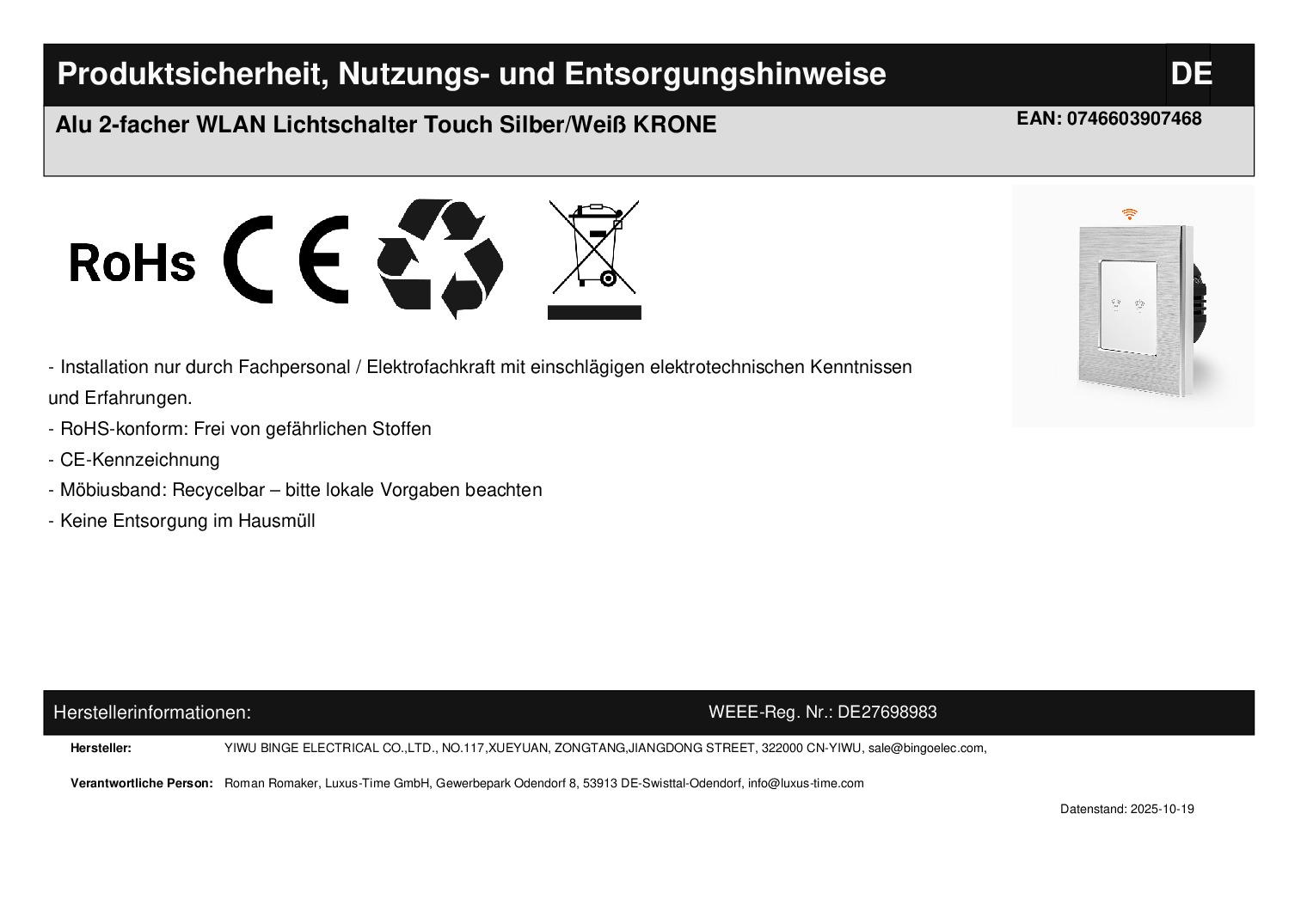 Dieser Artikel besteht aus einem silbernen, einfachen Aluminiumrahmen, sowie einem weißen WLAN-Touch-Serienschalter-Modul.Dies ist ein Luxus-Time Touch-WLAN-Serienschalter zum einfachen ein- und auszuschalten von zwei Leuchten. Zusätzlich verfügt dieser Schalter auch über eine WLAN-Funktion, sodass Sie den Schalter auch mit Ihrem Smartphone steuern können. Dazu können Sie die SmartLife App, Amazon Alexa, Google Home oder IFTT verwenden. Für die Verwendung der WLAN-Schalter ist ein Neutral- bzw. Null-Leiter notwendig . Einfache und schnelle Montage, sowohl vertikal als auch horizontal . Alle Touch-Schalter sind beleuchtet . Wenn die angeschlossene Leuchte ausgeschaltet ist, leuchtet der Schalter schwach blau, wenn die Leuchte eingeschaltet ist, leuchtet der Schalter in einem stärkeren Blau. Die Touch-Schalter sind mit allen Arten von Leuchten verwendbar (Halogen, LED, Energiesparlampen), außer LED-Strips . Bei LED-Strips ist die Watt-Zahl in den meisten Fällen zu gering und kann dadurch zu Problemen führen. Steuern Sie Ihre Tuya fähigen Produkte wie z. B. Lichtschalter, Kameras, Raumthermostate, etc. über unseren Smarten Touch Monitor. Sie können über den Monitor Szenen hinterlegen, Ihre Schalter steuern, Ihn als Tür Videotürsprechanlage nutzen oder als Schnittstelle für Zigbee und Amazon Alexa verwenden, wodurch die Nutzung eines Amazon Echos entfallen kann. Der Austausch erfolgt wie bei anderen Wipp-Schalter-Herstellern. Ersetzen Sie einfach Ihre alten Wipp-Schalter durch ein neues, langlebiges Design. Die Lichtschalter- und Steckdosen-Module sind für Unterputzdosen mit 60 mm Durchmesser geeignet . Die Module werden mittels der den Glasblenden beiliegenden Metallrahmen durch Schrauben an den Unterputzdosen befestigt. Hinweis zur Installation: Lichtschalter stromlos anschließen. Glasblende aufsetzen. Wichtig!!! Strom erst einschalten, wenn die Glasblende aufgesetzt wurde. Sollte dieser Hinweis nicht beachtet werden, kann es vorkommen, dass der Lichtschalter nicht reagiert. Fragen? Rufen Sie uns an oder senden Sie uns eine E-Mail. Wir beraten Sie gerne! Technische Daten::Abmessungen: 86 mm x 86 mm x 35 mm Betriebsspannung: 10A/AC110 ~ 250V, 50Hz60Hz max. Stromzufuhr für jeden Gang 2.5 A max. Leistung für jeden Gang: 1000W Ruhestromverbrauch: weniger als 0,1mW Lebensdauer: 100.000 Benutzungen Montage in Standard UP-Dose mit Durchmesser von 60mm mit Schraubgewinde Herstellerangaben:YIWU BINGE ELECTRICAL CO.,LTD.