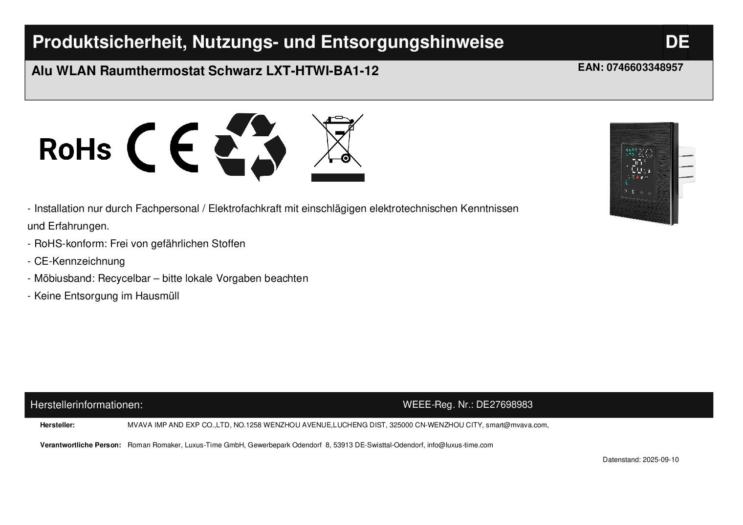 - 1 x WLAN-Raumthermostat LXT-HTWI, gemäß Bestellung