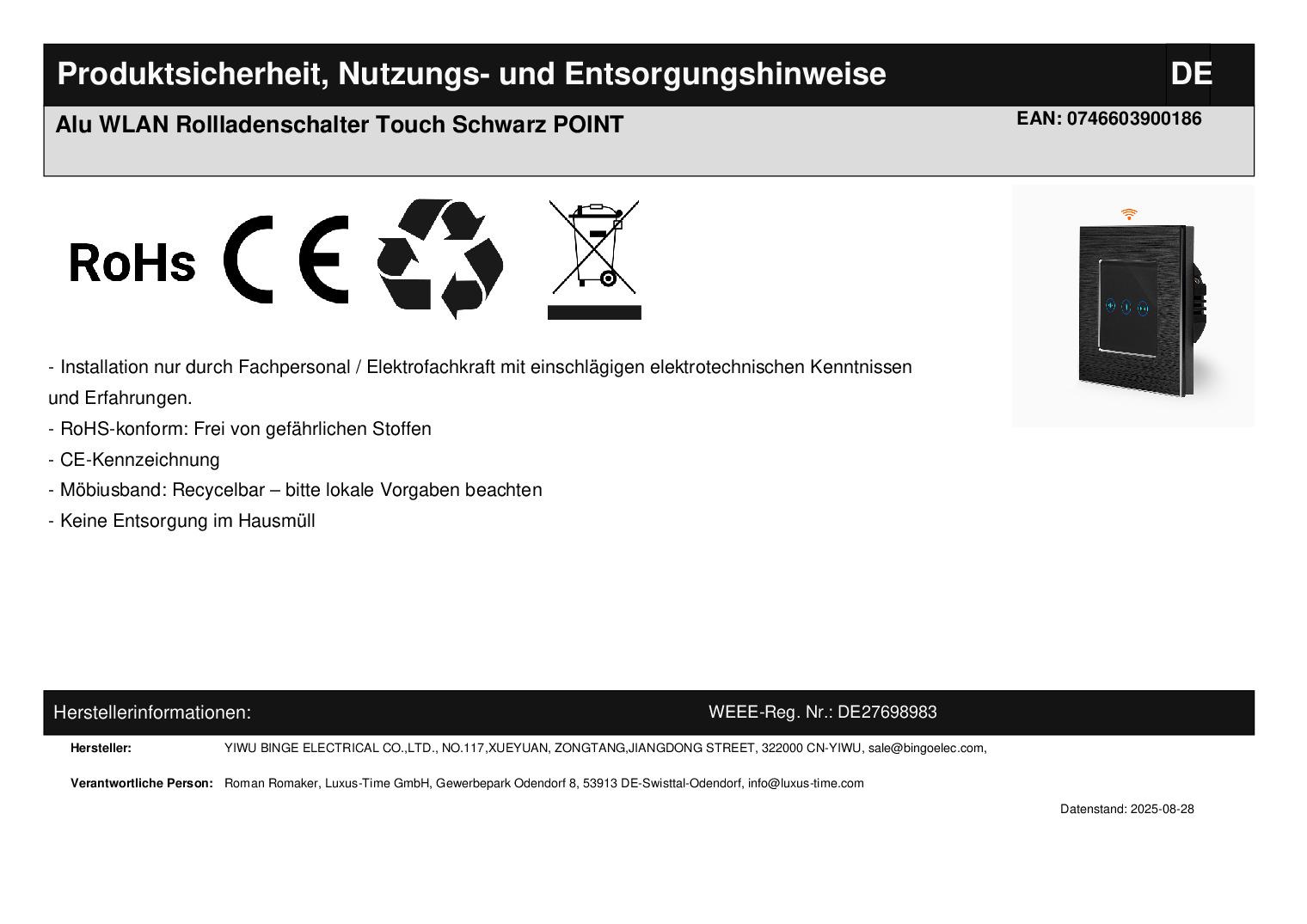 Dieser Artikel besteht aus einem schwarzen, einfachen Aluminiumrahmen, sowie einem schwarzen WLAN-Touch-Rollladenschalter-Modul.Dies ist ein Luxus Time Touch-Rollladenschalter zum hoch- und runterfahren von Rollladen, Jalousien, Raffstores usw. Durch ein erneutes Drücken des Rollladenschalters kann sowohl das Hoch- als auch das Runterfahren pausiert bzw. gestoppt werden. Zusätzlich verfügt dieser Schalter auch über eine WLAN-Funktion, sodass Sie den Schalter auch mit Ihrem Smartphone steuern können. Dazu können Sie die Tuya App, Amazon Alexa, Google Home oder IFTT verwenden. Einfache und schnelle Montage, sowohl vertikal als auch horizontal . Alle Touch-Schalter sind beleuchtet . Wenn die angeschlossene Leuchte ausgeschaltet ist, leuchtet der Schalter schwach blau, wenn die Leuchte eingeschaltet ist, leuchtet der Schalter in einem stärkeren Blau. Die Touch-Schalter sind mit allen Arten von Leuchten verwendbar (Halogen, LED, Energiesparlampen), außer LED-Strips . Bei LED-Strips ist die Watt-Zahl in den meisten Fällen zu gering und kann dadurch zu Problemen führen. Steuern Sie Ihre Tuya fähigen Produkte wie z. B. Lichtschalter, Kameras, Raumthermostate, etc. über unseren Smarten Touch Monitor. Sie können über den Monitor Szenen hinterlegen, Ihre Schalter steuern, Ihn als Tür Videotürsprechanlage nutzen oder als Schnittstelle für Zigbee und Amazon Alexa verwenden, wodurch die Nutzung eines Amazon Echos entfallen kann. Der Austausch erfolgt wie bei anderen Wipp-Schalter-Herstellern. Ersetzen Sie einfach Ihre alten Wipp-Schalter durch ein neues, langlebiges Design. Die Lichtschalter- und Steckdosen-Module sind für Unterputzdosen mit 60 mm Durchmesser geeignet . Die Module werden mittels der den Glasblenden beiliegenden Metallrahmen durch Schrauben an den Unterputzdosen befestigt. Hinweis zur Installation: Lichtschalter stromlos anschließen. Glasblende aufsetzen. Wichtig!!! Strom erst einschalten, wenn die Glasblende aufgesetzt wurde. Sollte dieser Hinweis nicht beachtet werden, kann es vorkommen, dass der Lichtschalter nicht reagiert. Fragen? Rufen Sie uns an oder senden Sie uns eine E-Mail. Wir beraten Sie gerne! Technische Daten::Abmessungen: 86 x 86 x 35 mm Betriebsspannung: 10A/AC110 ~ 250V, 50Hz60Hz max. Stromzufuhr für jeden Gang 2.5 A max. Leistung für jeden Gang: 1000W Ruhestromverbrauch: weniger als 0,1mW Lebensdauer: 100.000 Benutzungen Montage in Standard UP-Dose mit Durchmesser von 60mm mit Schraubgewinde Herstellerangaben:YIWU BINGE ELECTRICAL CO.,LTD.