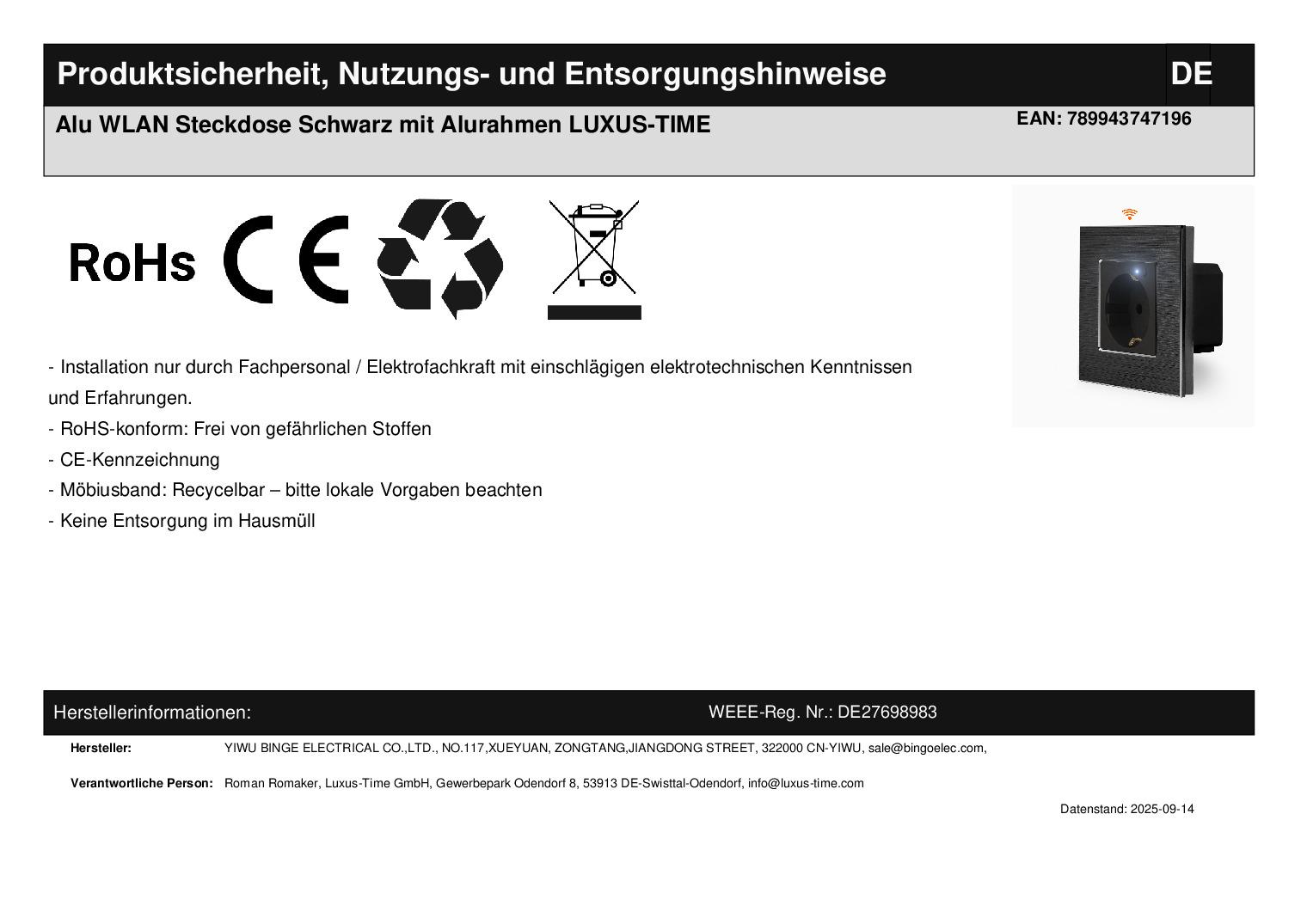 Luxus Time WLAN Steckdose mit Alu-Rahmen in SchwarzDieser Artikel besteht aus einem schwarzen, einfachen Aluminiumrahmen, sowie einem schwarzen WLAN-Steckdosen-Modul. Dies ist eine Luxus-Time zweifache WLAN-Steckdose. Diese Steckdose verfügt über eine WLAN-Funktion, sodass Sie die Steckdose über Ihr Smartphone steuern bzw. Routinen hinterlegen können. Die WLAN-Steckdose kann über die Tuya App, Amazon Alexa, Google Home oder IFTT gesteuert werden. Technische Daten: Herstellerangaben:YIWU BINGE ELECTRICAL CO.,LTD.