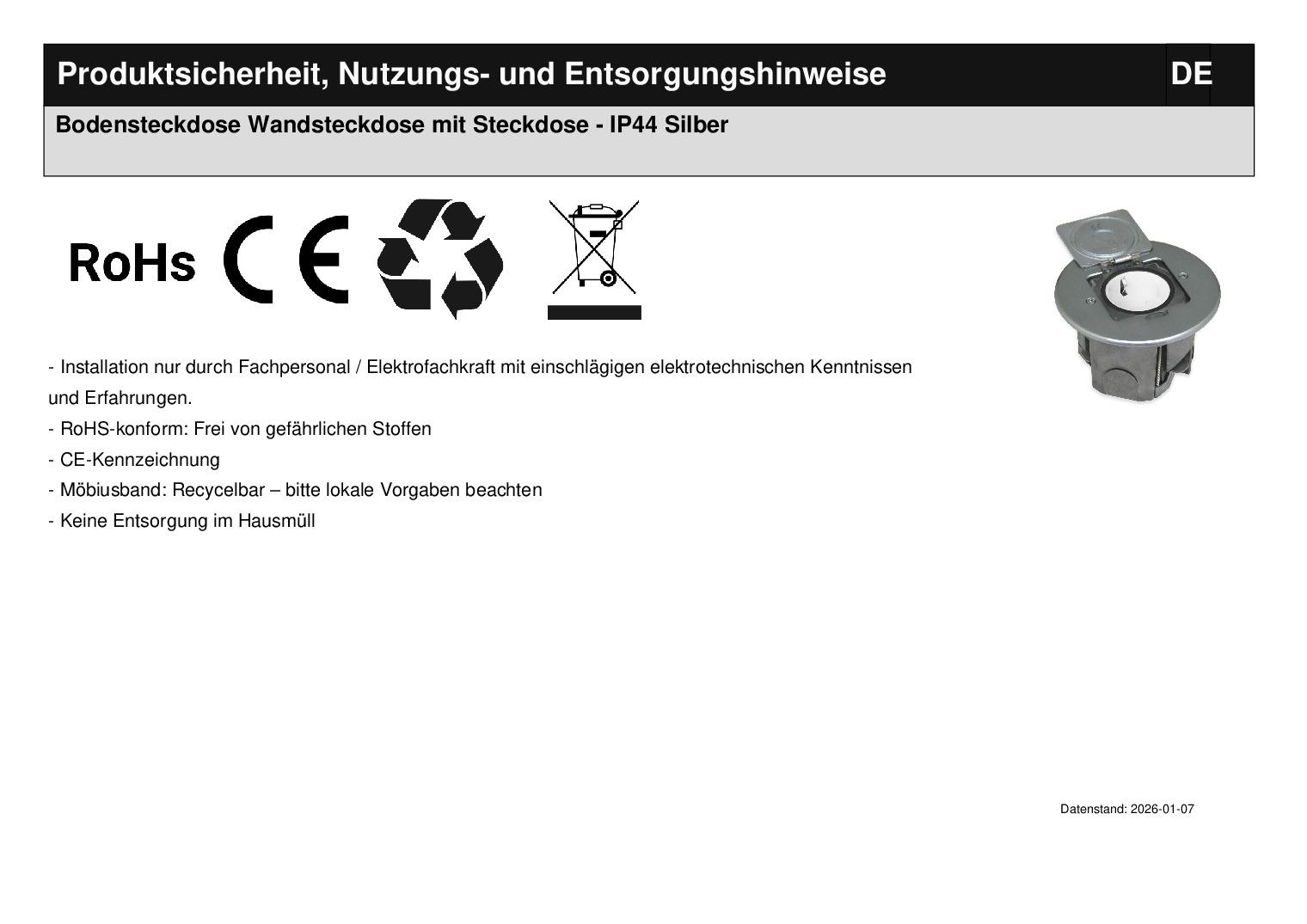 Bodentank Fußbodensteckdose Edelstahl mit einer weißen VDE SteckdoseDieser Bodentank mit Edelstahldeckel kann in trocken gepflegte Hohlböden und Estrichböden eingebaut werden. Dieser Tank wird mit einem weißen VDE Steckdosen-Modul ausgeliefert. Optimal für den Einbau in Büros, Werkstätten, Garagen oder Verkaufsräumen. Dieser hochwertige Bodentank kann fast überall eingesetzt werden und kann auch überfahren werden. Er bietet auch im Alltag ein hohes Maß an Flexibilität, da bei Nichtgebrauch der Deckel komplett versenkt werden kann und somit sehr unauffällig ist. Für den Einbau in Estrich ist ein sogenannter Schutzdeckel nötig. Dieser ist im Lieferumfang nicht enthalten. Optional kann eine Höhenerweiterung verwendet werden, sollte der Tank nicht hoch genug für den Bodenaufbau sein. Die Einsätze werden in den abschraubbaren Gerätebecher eingerastet und dann angeschlossen. Zum Schluss wird der Edelstahldeckel verschraubt. Technische Daten:
