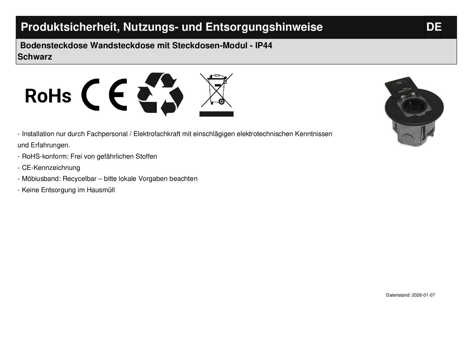 Abmessungen:Deckel: ø 110 mm Dose: ø 66 mm Lochmaß für Kabel: ø 20 mm Tiefe (Dose): 50 mm Lochmaß für Einsätze: 45mm x 45mm Lieferumfang: Im Lieferumfang enthalten ist: