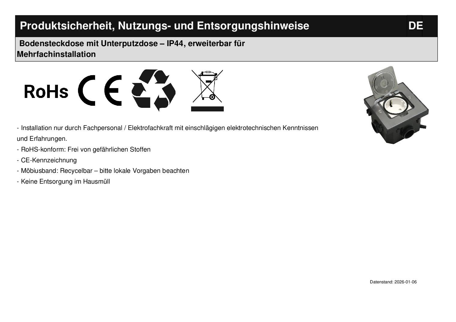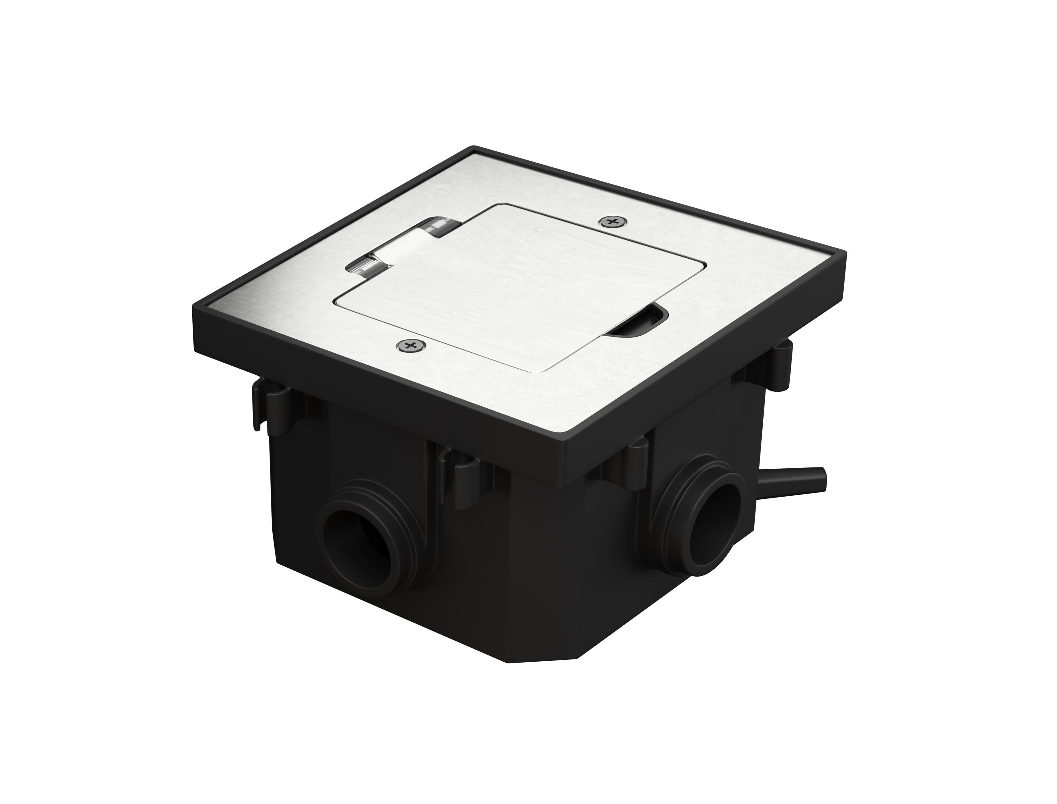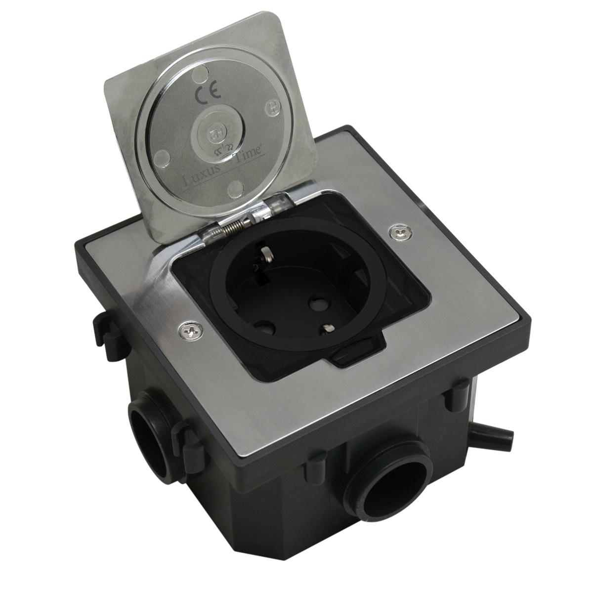Erweiterbarer Bodentank Fußbodensteckdose Edelstahl mit SteckdoseDieser Bodentank mit Edelstahldeckel kann in trocken gepflegte Hohlböden und Estrichböden eingebaut werden. Der Tank kann ohne z. B. Wellrohr mit einem weiteren, baugleichen Tank verbunden werden. Der Tank wird mit schwarzer VDE Steckdose ausgeliefert. Achtung: Bitte beachten Sie, das aufgrund der Bauweise, die Steckdose mit USB-C Anschluss und die 1/2 Module nicht optimal verwendet werden können. Optimal für den Einbau in Büros, Werkstätten, Garagen oder Verkaufsräumen. Dieser hochwertige Bodentank kann fast überall eingesetzt werden und kann auch überfahren werden. Er bietet auch im Alltag ein hohes Maß an Flexibilität, da bei Nichtgebrauch der Deckel komplett versenkt werden kann und somit sehr unauffällig ist. Für den Einbau in Estrich ist ein sogenannter Schutzdeckel nötig. Dieser ist im Lieferumfang enthalten. Optional kann eine Höhenerweiterung verwendet werden, sollte der Tank nicht hoch genug für den Bodenaufbau sein. Die Einsätze werden in den abschraubbaren Gerätebecher eingerastet und dann angeschlossen. Zum Schluss wird der Edelstahldeckel verschraubt. Technische Daten: