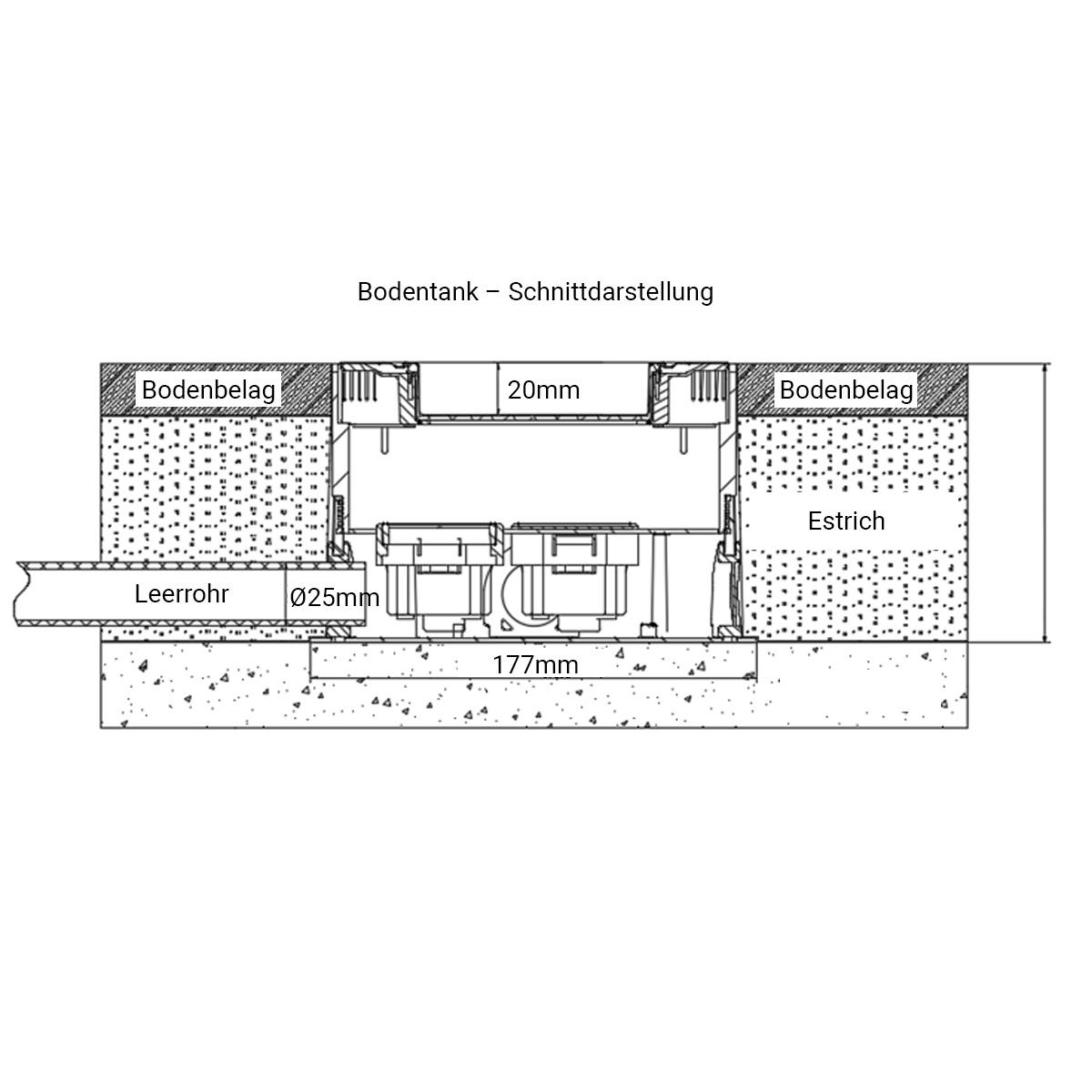 Bodentank Fußbodensteckdose Aluminium mit drei SteckdosenDieser Bodentank aus lackiertem Aluminium hat die Möglichkeit einen Teil des Bodenbelags im Deckel zu verbauen und kann in trocken gepflegte Hohlböden und Estrichböden eingebaut werden. Der Tank wird mit drei einfachen VDE Steckdosen-Modulen in Weiß geliefert. Optimal für den Einbau in Büros, Werkstätten, Garagen oder Verkaufsräumen. Dieser hochwertige Bodentank kann fast überall eingesetzt werden und kann auch überfahren werden. Er bietet auch im Alltag ein hohes Maß an Flexibilität, da bei Nichtgebrauch der Deckel komplett versenkt werden kann und somit sehr unauffällig ist. Bei Gebrauch kann der Deckel in den meisten Fällen geschlossen werden und die Kabel können über Auslässe aus dem Deckel herausgeführt werden. Für den Einbau in Estrich ist ein sogenannter Schutzdeckel nötig. Dieser ist im Lieferumfang nicht enthalten. Optional kann eine Höhenerweiterung verwendet werden, sollte der Tank nicht hoch genug für den Bodenaufbau sein. Die Einsätze werden in den abschraubbaren Gerätebecher eingerastet und dann angeschlossen. Zum Schluss wird der Edelstahldeckel verschraubt und der Bodenbelag im Deckel eingesetzt. Technische Daten: