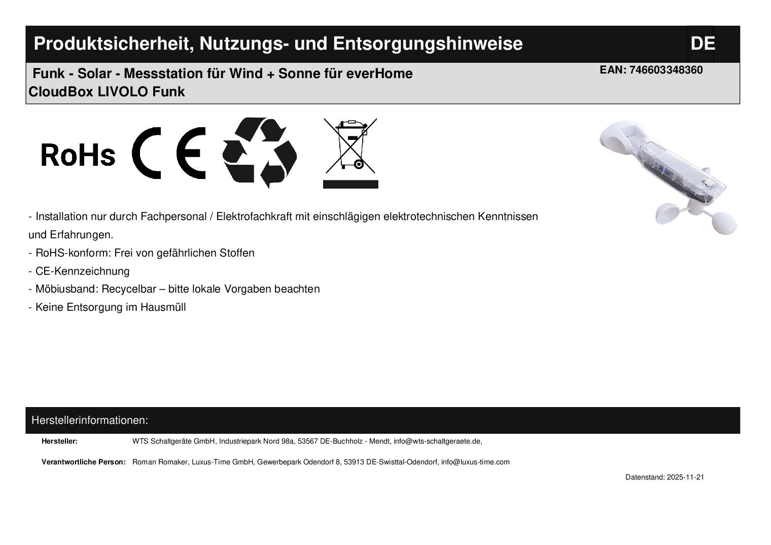 Livolo Funk-Wetterstation für Außen mit Wind- und Sonnensensor Diese Wetterstation gibt per Funk aktuelle Messwerte für Wind und Sonne an die everHome CloudBox weiter und verfügt über einen Akku, der über die integrierten Solar-Module aufgeladen wird. Ein Stromanschluss wird dadurch überflüssig und die Montage kann flexibel vorgenommen werden. Dadurch können Markisen, Jalousien, Raffstores etc. anhand der Wetterdaten hoch- oder runtergefahren werden. Besonders bei Raffstores ist es wichtig, dass diese hochgefahren werden, wenn der Wind zu stark weht . Die Empfindlichkeit der Sensoren kann dabei eingestellt werden, sodass eine individuelle Steuerung aufgrund persönlicher Vorlieben erreicht werden kann. Der Sensor gibt z. B. die Sonneneinstrahlung als Signal an die everHome CloudBox weiter. Diese ermittelt anhand von voreingestellten Merkmalen ob die Jalousien heruntergefahren werden müssen und gibt dieses Signal an die Livolo Funk-Rollladenschalter weiter. So haben Sie auch im Sommer ein angenehm kühles Haus ohne vor Ort gewesen zu sein. Dasselbe gilt natürlich auch für die Werte des Windsensors. Erreicht der Wind eine zu hohe Geschwindigkeit , wird das Signal über die CloudBox an die Livolo Funk-Rolllandeschalter weitergeleitet und diese fahren z. B. die Markise ein, um Schäden zu vermeiden . Der Sonnen-Sensor kann nach Belieben auch ausgeschaltet werden, indem man am Sensor selbst den Wert auf „0“ setzt. Durch die Kombination aus der Wetterstation, der everHome CloudBox und den Livolo-Funk-Rollladenschaltern entsteht ein sichereres und komfortableres Smart Home für Sie . Bei uns erhalten Sie die komplette Livolo Bandbreite; von einem einfachen Wipp-Lichtschalter bis zum smarthome-fähigen Touch-Rollladenschalter. Fragen? Rufen Sie uns an oder senden Sie uns eine E-Mail. Wir beraten Sie gerne! Technische Daten: Funk-Frequenz: 433MHz SmartHome-Komptabilität: everHome CloudBox Akku: 3,7V – 600 mAh Temperaturbereich: - 10 °C bis + 60 °C Reichweite ca. 100 m (außen) Abmessungen: Abhängig von der Art der Montage max. 195 mm Lieferumfang: Im Lieferumfang enthalten ist: - 1 x Funk-Wetter-Station, gemäß Bestellung - Bedienungsanleitung Hinweis: Vor der Installation muss die Messstation einmalig über den USB-C Anschluss aufgeladen werden. Herstellerangaben:WTS Schaltgeräte GmbH