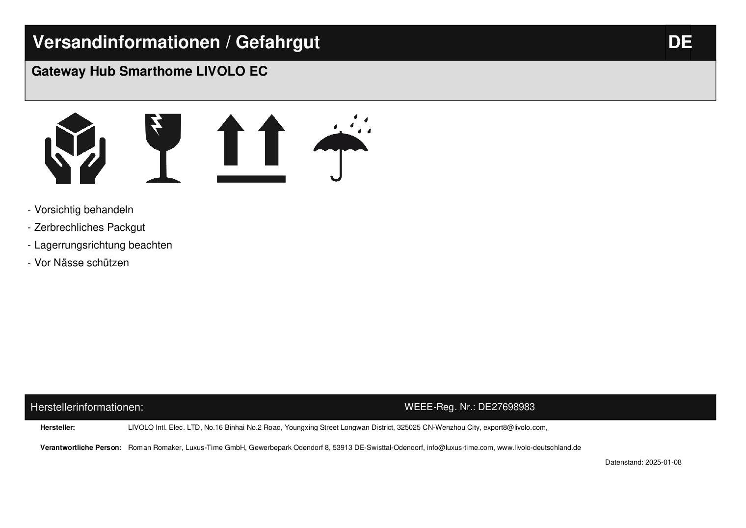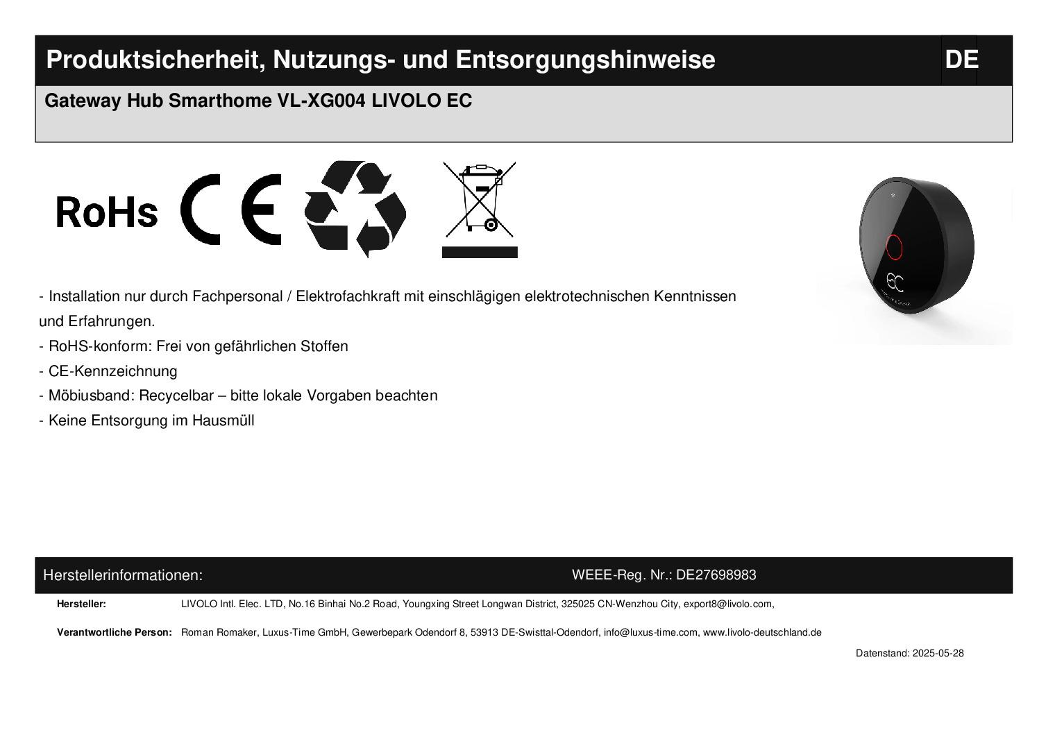 Livolo EC GatewayDas Livolo EC Gateway ermöglicht es Ihnen, unsere Livolo EC-Schalter und -Module über Ihr Smartphone oder Tablet zu steuern oder Routinen bzw. Zeitpläne anzulegen. Das Gateway kann bis zu 80 Livolo Schalter/Steckdosen und 32 batteriebetriebene Livolo Geräte unterstützen. Die Anbindung an Amazon Alexa und Google Home ist inklusive. Sie können in der App jederzeit weitere Gateways hinzufügen, sollte dies nötig sein. Pro Wechselschaltung benötigen Sie nur einen EC-fähigen Wechselschalter. Bitte beachten Sie, dass die Livolo EC Produkte nur mit dem Livolo EC Gateway genutzt werden kann. Wenn Sie dieses Gateway verwenden, ersparen Sie sich aufwändiges Programmieren. Mit ein paar Klicks können Sie z. B. festlegen, dass die Außenbeleuchtung jeden Abend zu einer bestimmten Uhrzeit angeschaltet werden. Technische Daten: Adapter (nicht im Lieferumfang enthalten) Input: 110~250V AC ~ 50/60Hz 0.15A Output: 5V - 1000mA Steuerung: Livolo Home App Kompatibel: Nur mit Livolo EC Lichtschalter Smarte Systeme: Google Home, Amazon Alexa Spannung: 110~250V AC Ruhestromverbrauch: weniger als 0.1mW Betriebsumgebung: -30 ~ 70 Grad Celsius; weniger als 95% rF Material: Kunststoff, Glas WLAN: 2.4 GHz EC Abmessungen: 70 x 70 x 20 mm Lieferumfang: Im Lieferumfang enthalten ist: