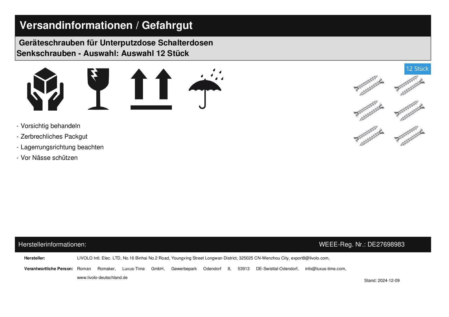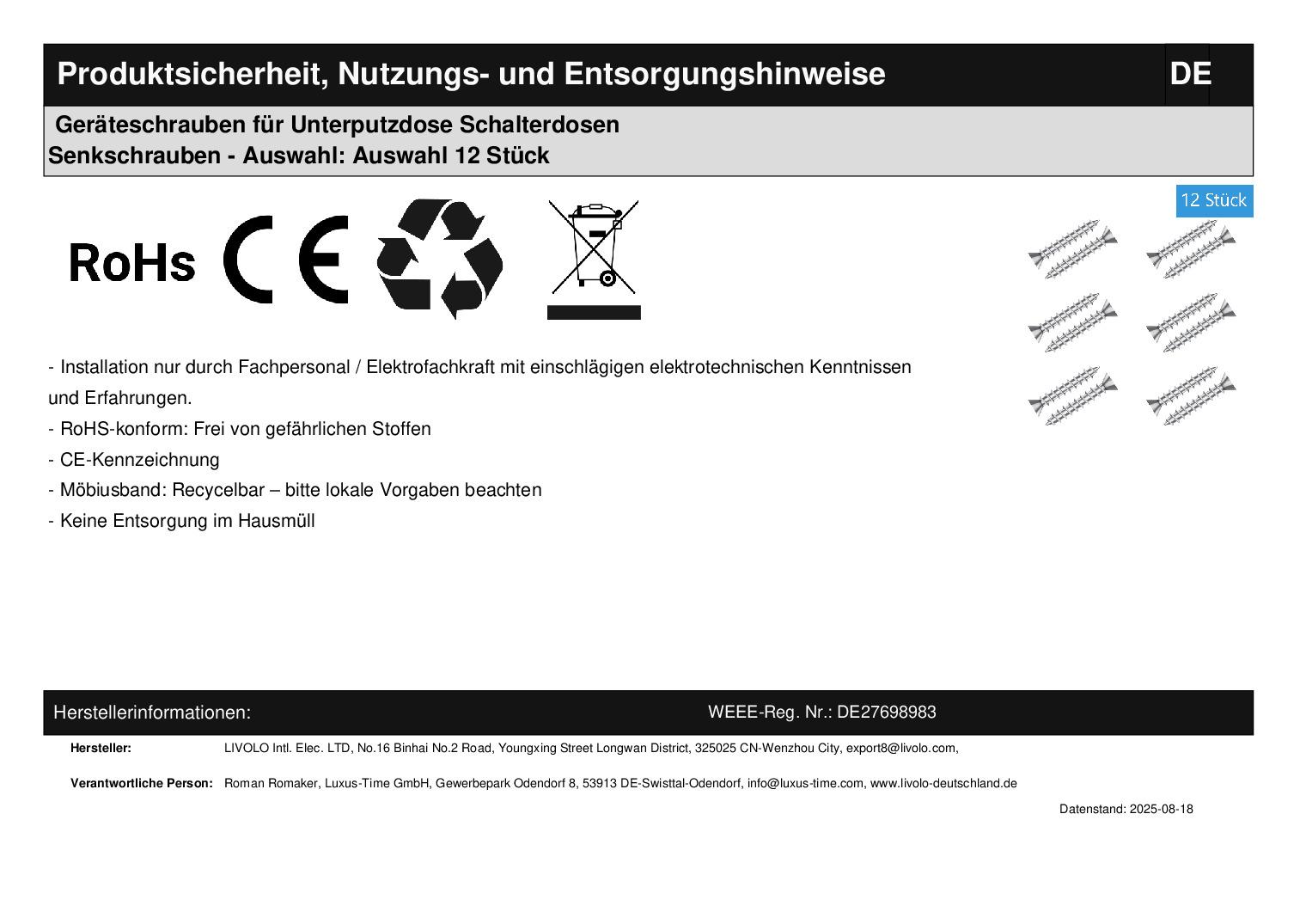 12x Montageschrauben für Unterputzdosen
