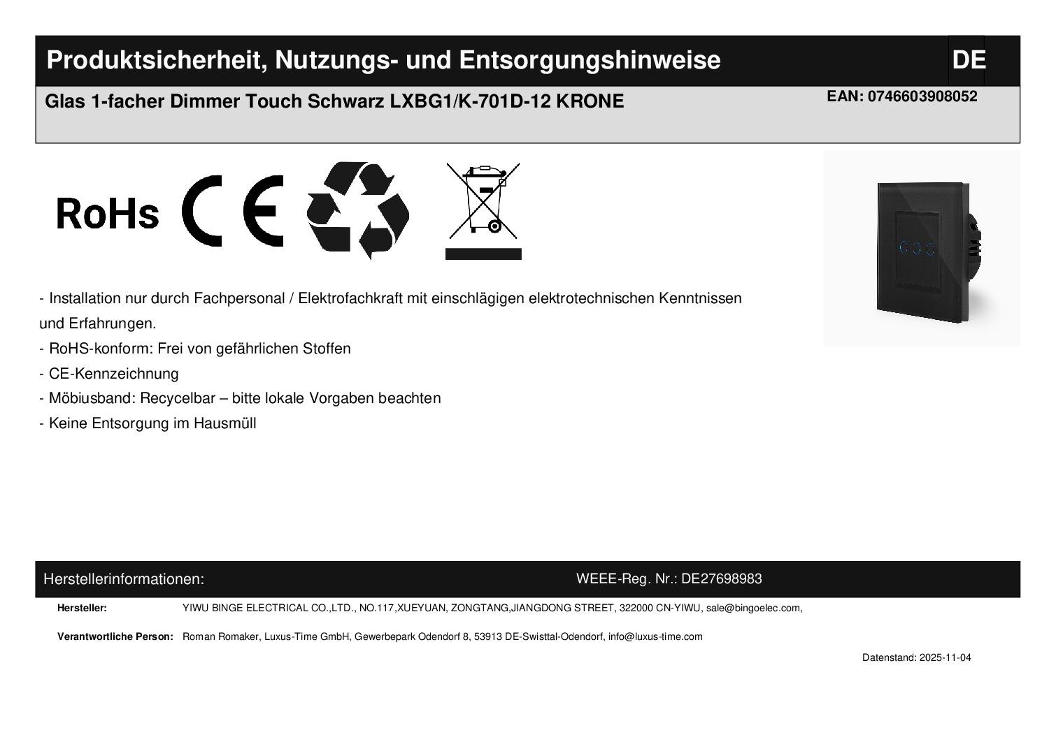 Sollte dieser Hinweis nicht beachtet werden, kann es vorkommen, dass der Lichtschalter nicht reagiert. Fragen? Rufen Sie uns an oder senden Sie uns eine E-Mail. Wir beraten Sie gerne! Technische Daten: