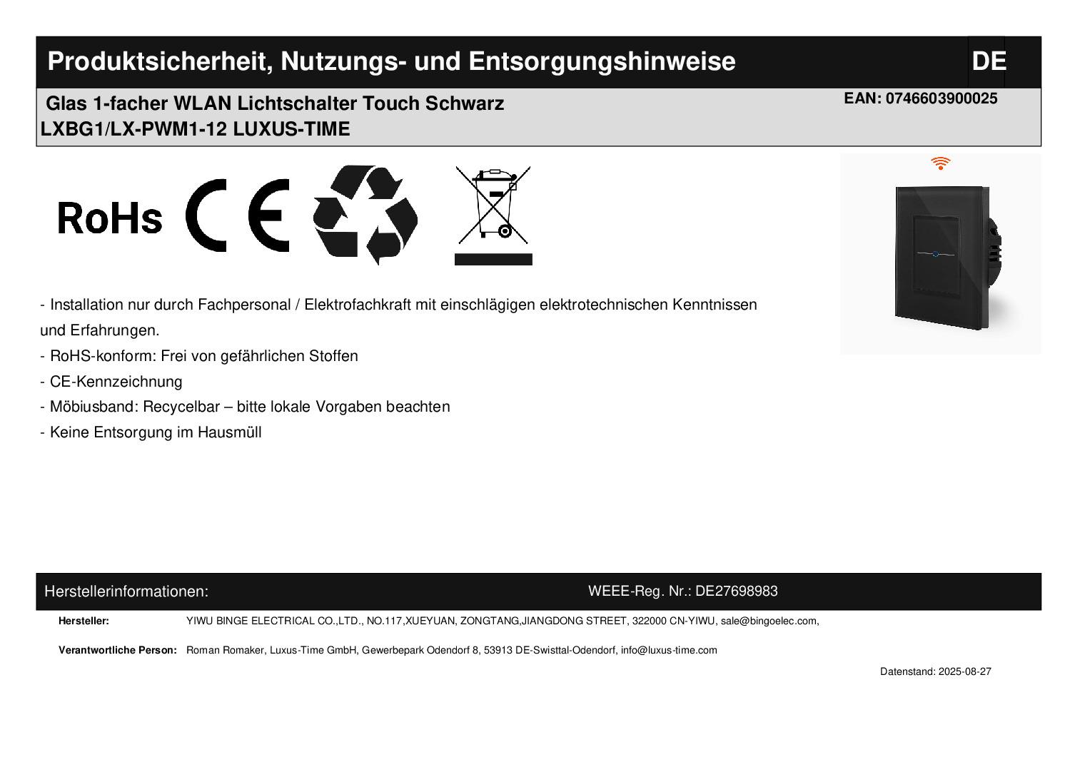 Dieser Artikel besteht aus einem schwarzen, einfachen Glasrahmen, sowie einem schwarzen Touch-Schalter-Modul.Dies ist ein Luxus-Time Touch-WLAN-Lichtschalter zum einfachen ein- und auszuschalten von einer Leuchte. Zusätzlich verfügt dieser Schalter auch über eine WLAN-Funktion, sodass Sie den Schalter auch mit Ihrem Smartphone steuern können. Dazu können Sie die SmartLife App, Amazon Alexa, Google Home oder IFTT verwenden. Zusätzlich kann der Schalter über die Tuya App als Wechselschalter definiert werden. Für die Verwendung der WLAN-Schalter ist ein Neutral- bzw. Null-Leiter notwendig . Einfache und schnelle Montage, sowohl vertikal als auch horizontal . Alle Touch-Schalter sind beleuchtet . Wenn die angeschlossene Leuchte ausgeschaltet ist, leuchtet der Schalter schwach blau, wenn die Leuchte eingeschaltet ist, leuchtet der Schalter in einem stärkeren Blau. Die Touch-Schalter sind mit allen Arten von Leuchten verwendbar (Halogen, LED, Energiesparlampen), außer LED-Strips . Bei LED-Strips ist die Watt-Zahl in den meisten Fällen zu gering und kann dadurch zu Problemen führen. Steuern Sie Ihre Tuya fähigen Produkte wie z. B. Lichtschalter, Kameras, Raumthermostate, etc. über unseren Smarten Touch Monitor. Sie können über den Monitor Szenen hinterlegen, Ihre Schalter steuern, Ihn als Tür Videotürsprechanlage nutzen oder als Schnittstelle für Zigbee und Amazon Alexa verwenden, wodurch die Nutzung eines Amazon Echos entfallen kann. Diesen WiFi-Schalter können Sie über die App als Wechselschalter definieren. Hierzu gehen Sie bitte wie folgt vor: Nach Installation und Inbetriebnahme verbinden Sie den Schalter mit der App. Sobald der Schalter mit der App verbunden ist, haben Sie die Möglichkeit Einstellungen vorzunehmen. Dafür klicken Sie auf das Stift-Symbol in der rechten oberen Ecke beim Schalter. Es öffnet sich ein Menü. Hier wählen Sie bitte die Funktion „Verbindung mit mehreren Steuerungen“ Im nächsten Schritt, haben Sie die Möglichkeit, hier verschiedene Schalter aus einem Lichtkries als Wechselschalter zu gruppieren. Der Austausch erfolgt wie bei anderen Wipp-Schalter-Herstellern. Ersetzen Sie einfach Ihre alten Wipp-Schalter durch ein neues, langlebiges Design. Die Lichtschalter- und Steckdosen-Module sind für Unterputzdosen mit 60 mm Durchmesser geeignet . Die Module werden mittels der den Glasblenden beiliegenden Metallrahmen durch Schrauben an den Unterputzdosen befestigt. Hinweis zur Installation: Lichtschalter stromlos anschließen. Glasblende aufsetzen. Wichtig!!! Strom erst einschalten, wenn die Glasblende aufgesetzt wurde. Sollte dieser Hinweis nicht beachtet werden, kann es vorkommen, dass der Lichtschalter nicht reagiert. Fragen? Rufen Sie uns an oder senden Sie uns eine E-Mail. Wir beraten Sie gerne! Technische Daten::Abmessungen: 86 mm x 86 mm x 35 mm Betriebsspannung: 10A/AC110 ~ 250V, 50Hz60Hz max. Stromzufuhr für jeden Gang 2.5 A max. Leistung für jeden Gang: 1000W Ruhestromverbrauch: weniger als 0,1mW Lebensdauer: 100.000 Benutzungen Montage in Standard UP-Dose mit Durchmesser von 60mm mit Schraubgewinde Herstellerangaben:YIWU BINGE ELECTRICAL CO.,LTD.