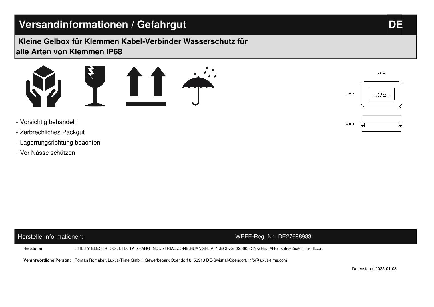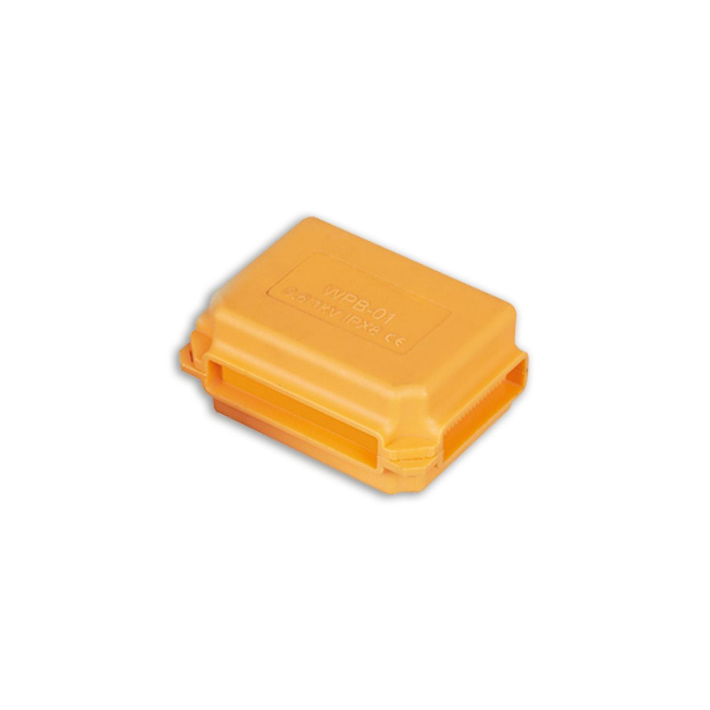 4 St. Orange Gelbox zur wasserdichten Kabelverbindung IPX8Dieser Kabelverbinder ist komplett mit einem Gel gefüllt, dass Kabel vor Wasser schützt, selbst bei einer dauerhaften Anwendung bis zu 1,5m unter Wasser. Durch die kompakte Größe können die Gelboxen selbst in Unterputzdosen platziert werden. Dennoch können bis zu zweifache Steckverbinder in der Gelbox untergebracht werden. Verwendet werden kann die Box für Nieder- und Kleinspannungsbereiche bei einem Kabeldurchschnitt von 4 mm². Das Gel ist transparent und für den Menschen ungefährlich. Technische Daten:Schutzklasse: IP68 Gel: UL94-HB Abmessungen: 45 x 32 x 24 mm (außen) 31 x 21 x 20 mm (innen) Herstellerangaben:UTILITY ELECTRICAL CO., LTD