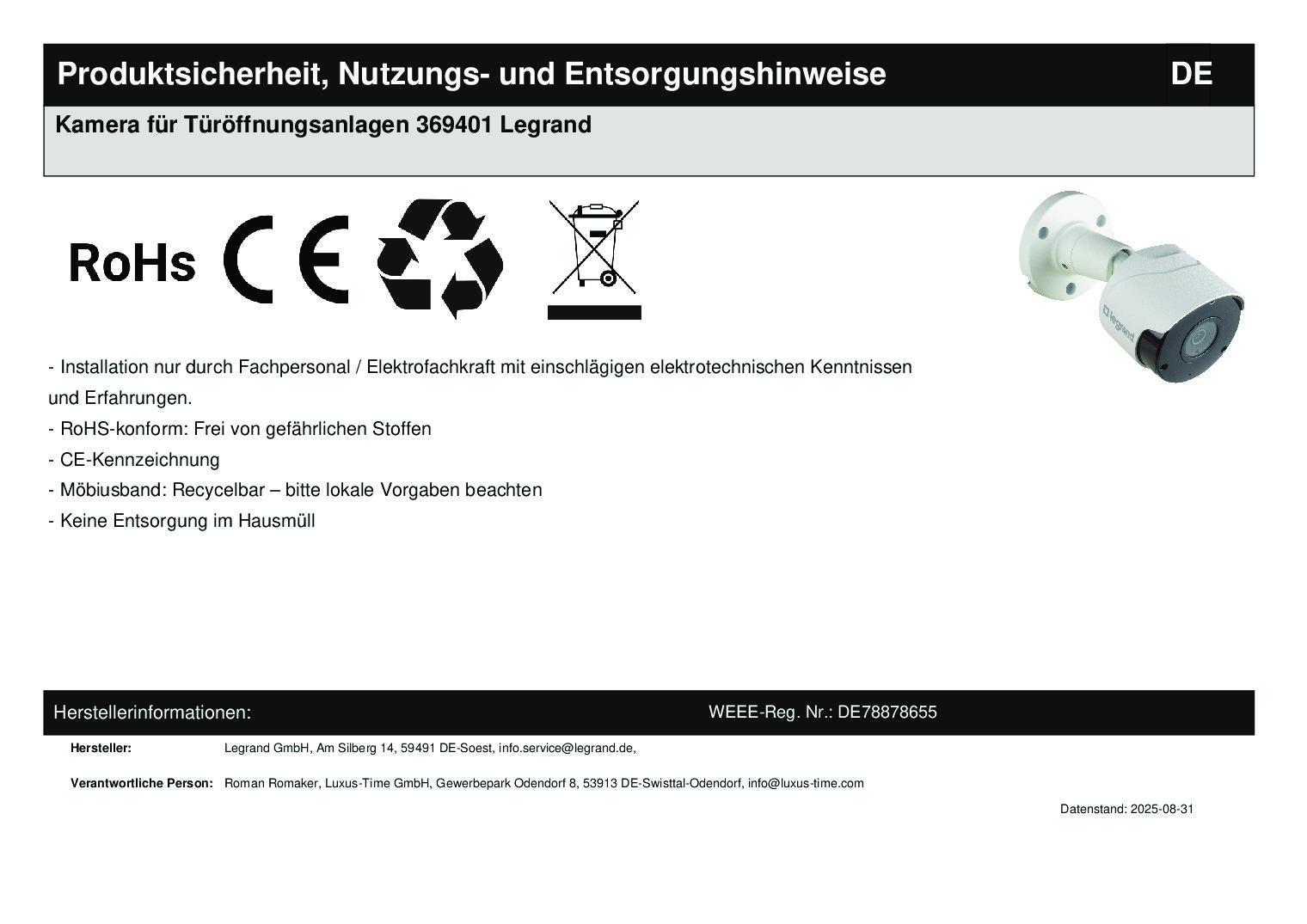- 1x Kamera f. Tag/Nacht - Netzkabel (15 m) - Videokabel (30 m) - Bedienungsanleitung Herstellerangaben:Legrand GmbH