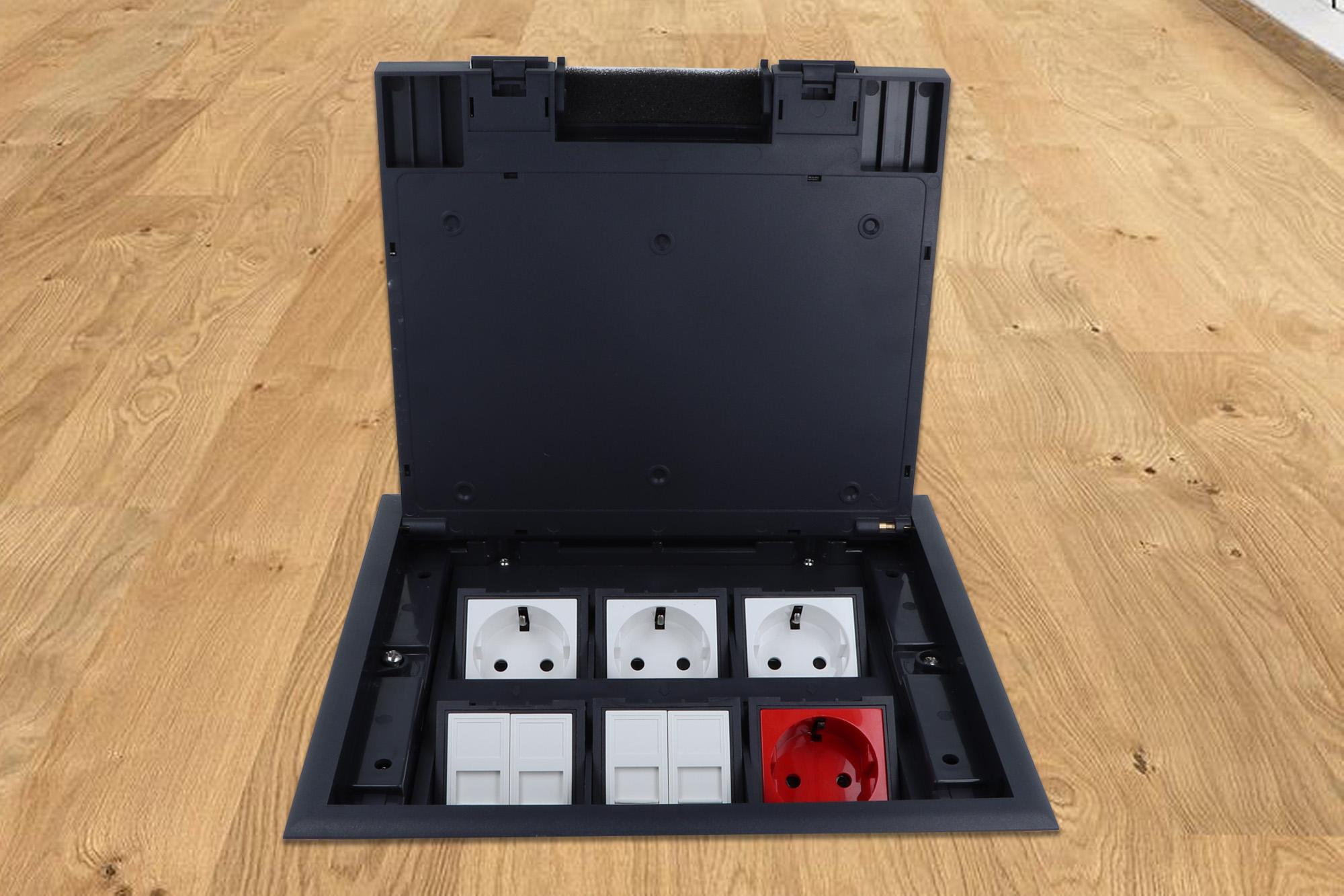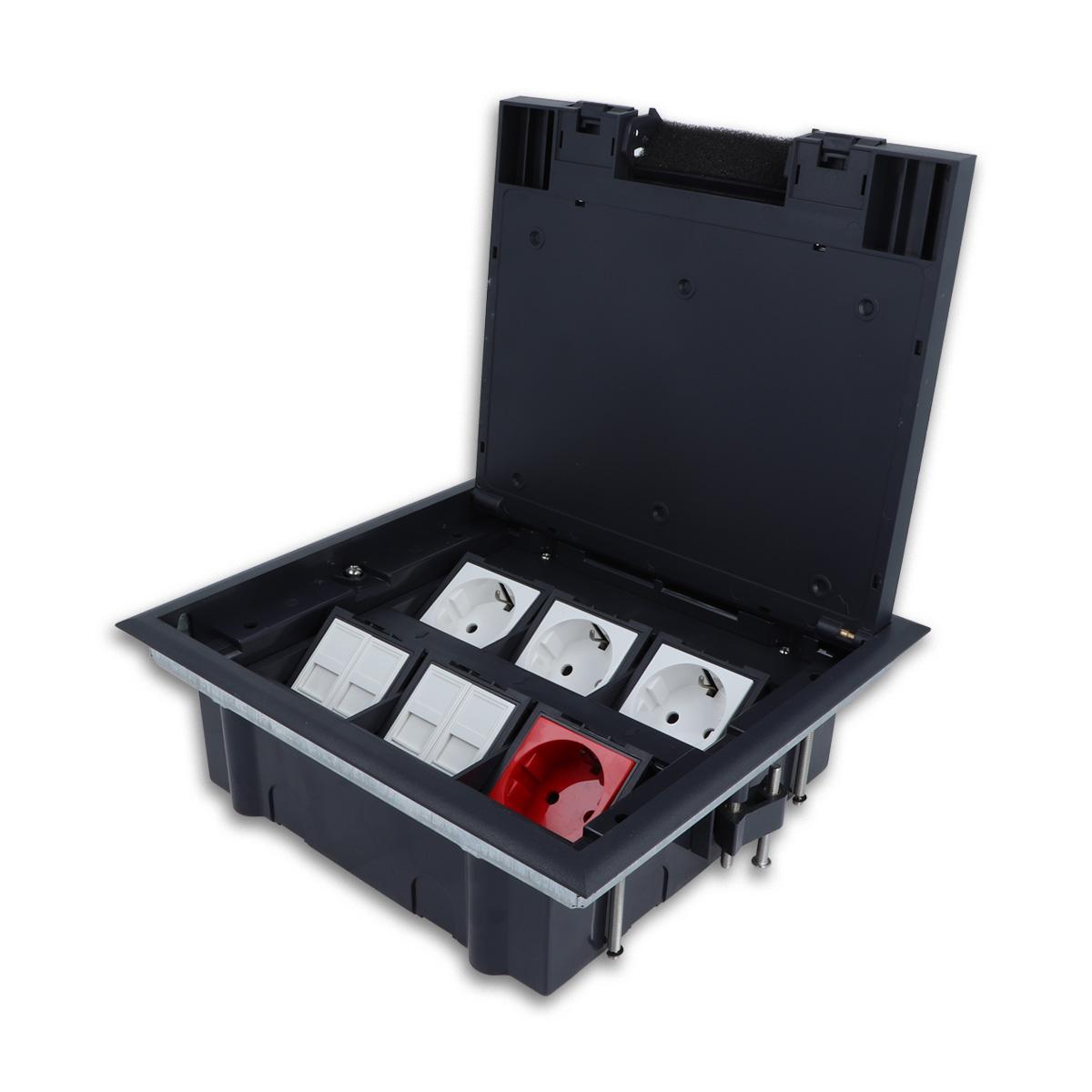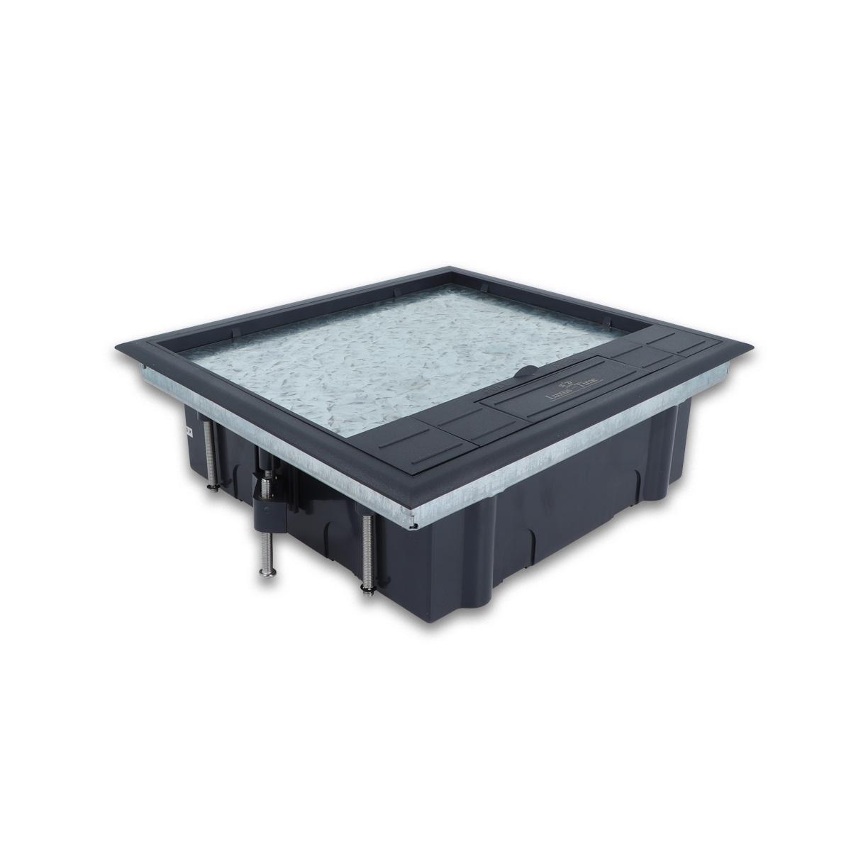 Bodentank Fußbodensteckdose Kunststoff mit vier Steckdosen und vier Datendosen (Netzwerkdosen) Dieser Bodentank aus Kunststoff hat die Möglichkeit einen Teil des Bodenbelags im Deckel zu verbauen. Er kann in trocken gepflegte Hohlböden und Estrichböden eingebaut werden. Optimal für den Einbau in Büros, Werkstätten, Garagen oder Verkaufsräumen. Dieser hochwertige Bodentank kann fast überall eingesetzt werden. Er bietet auch im Alltag ein hohes Maß an Flexibilität, da bei Nichtgebrauch der Deckel komplett versenkt werden kann und somit sehr unauffällig ist. Bei Gebrauch kann der Deckel in den meisten Fällen geschlossen werden und die Kabel können über Auslässe aus dem Deckel herausgeführt werden. Für den Einbau in Estrich liegt eine Anleitung bei. Diese finden Sie auch im Produktdatenblatt unterhalb der Artikelbeschreibung. Beim Einbau in Trockenestrich kann eine Montagedose verwendet werden. Optional kann eine Höhenerweiterung verwendet werden, sollte der Tank nicht hoch genug für den Bodenaufbau sein. Die Einsätze werden in den abschraubbaren Gerätebecher eingerastet und dann angeschlossen. Zum Schluss wird der Kunststoffdeckel verschraubt und der Bodenbelag eingeklebt. Fragen? Rufen Sie uns an oder senden Sie uns eine E-Mail. Wir beraten Sie gerne! Technische Daten: Schutzart: IP20 Material: Kunststoff Löcher: 6 Stück Geeignet für Estrich Abmessungen: Fliesen Einsatz: 22,4 cm x 15,4 cm x 1,1 cm Deckel: 22,9 x 20,0 cm Dose: 24,50 x 22,50 cm Lochmaß für Kabel: D-2,50 cm Tiefe (Dose): 7,50 cm Gerätebecher: 19,0 x 19,0 cm (abschraubbar) Lochmaß für Einsätze: 4,50 x 4,50 cm Lieferumfang: Im Lieferumfang enthalten ist: 1x Bodentank 6 Fach