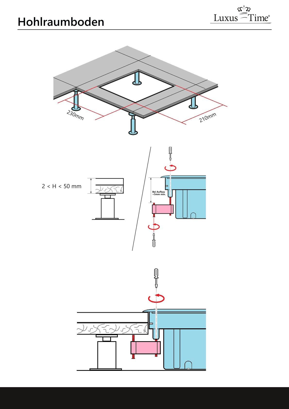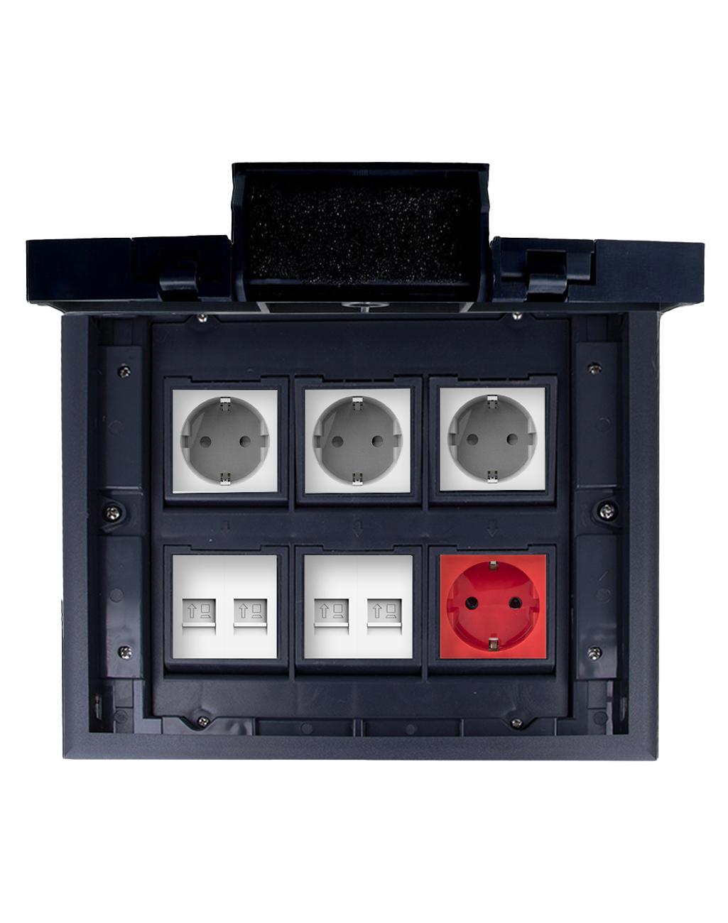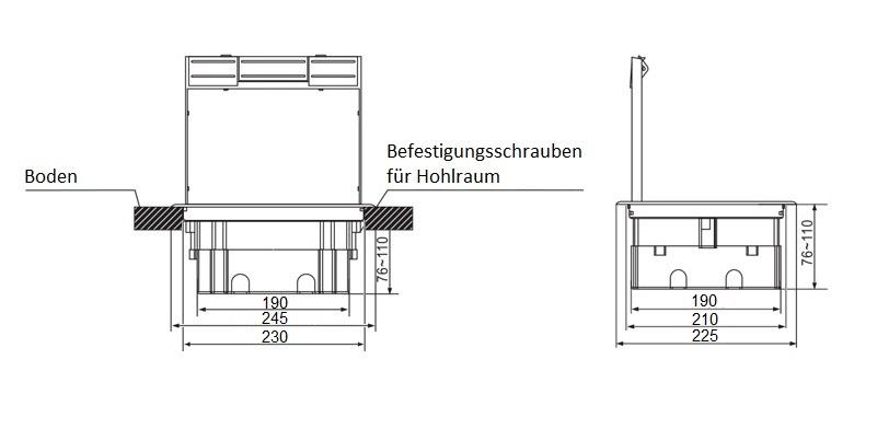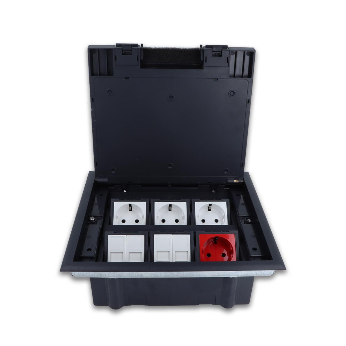 Bodentank Fußbodensteckdose Kunststoff mit vier Steckdosen und vier Datendosen (Netzwerkdosen) Dieser Bodentank aus Kunststoff hat die Möglichkeit einen Teil des Bodenbelags im Deckel zu verbauen. Er kann in trocken gepflegte Hohlböden und Estrichböden eingebaut werden. Optimal für den Einbau in Büros, Werkstätten, Garagen oder Verkaufsräumen. Dieser hochwertige Bodentank kann fast überall eingesetzt werden. Er bietet auch im Alltag ein hohes Maß an Flexibilität, da bei Nichtgebrauch der Deckel komplett versenkt werden kann und somit sehr unauffällig ist. Bei Gebrauch kann der Deckel in den meisten Fällen geschlossen werden und die Kabel können über Auslässe aus dem Deckel herausgeführt werden. Für den Einbau in Estrich liegt eine Anleitung bei. Diese finden Sie auch im Produktdatenblatt unterhalb der Artikelbeschreibung. Beim Einbau in Trockenestrich kann eine Montagedose verwendet werden. Optional kann eine Höhenerweiterung verwendet werden, sollte der Tank nicht hoch genug für den Bodenaufbau sein. Die Einsätze werden in den abschraubbaren Gerätebecher eingerastet und dann angeschlossen. Zum Schluss wird der Kunststoffdeckel verschraubt und der Bodenbelag eingeklebt. Fragen? Rufen Sie uns an oder senden Sie uns eine E-Mail. Wir beraten Sie gerne! Technische Daten: Schutzart: IP20 Material: Kunststoff Löcher: 6 Stück Geeignet für Estrich Abmessungen: Fliesen Einsatz: 22,4 cm x 15,4 cm x 1,1 cm Deckel: 22,9 x 20,0 cm Dose: 24,50 x 22,50 cm Lochmaß für Kabel: D-2,50 cm Tiefe (Dose): 7,50 cm Gerätebecher: 19,0 x 19,0 cm (abschraubbar) Lochmaß für Einsätze: 4,50 x 4,50 cm Lieferumfang: Im Lieferumfang enthalten ist: 1x Bodentank 6 Fach