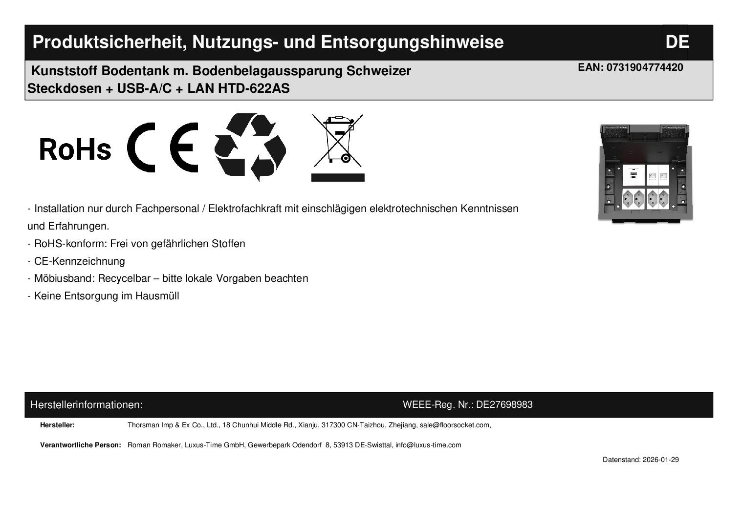 Bodentank Fußbodensteckdose Kunststoff für bis zu 8 ½ Livolo ModuleDieser Bodentank aus Kunststoff hat die Möglichkeit einen Teil des Bodenbelags im Deckel zu verbauen. Er kann in trocken gepflegte Hohlböden und Estrichböden eingebaut werden. Die vier Schweizer Steckdosen haben eine integrierte Kindersicherung und Schraubanschlüsse. Das Auflade Modul lädt mit 65W in Weiß mit einem USB-C und einem USB-A Anschluss. So können Sie zwei Geräte gleichzeitig aufladen, z. B. Ihr Smartphone und Ihren Laptop . Der USB-A Anschluss unterstützt QC3.0 , mit dem die meisten Smartphones schnell geladen werden können. Über den USB-C Anschluss können Laptops mit dem PD Protokoll geladen werden. Das Netzwerk-Modul hat CAT5e und ist eine Enddose. Optimal für den Einbau in Büros, Werkstätten, Garagen oder Verkaufsräumen. Dieser hochwertige Bodentank kann fast überall eingesetzt werden. Er bietet auch im Alltag ein hohes Maß an Flexibilität, da bei Nichtgebrauch der Deckel komplett versenkt werden kann und somit sehr unauffällig ist. Bei Gebrauch kann der Deckel in den meisten Fällen geschlossen werden und die Kabel können über Auslässe aus dem Deckel herausgeführt werden. Für den Einbau in Estrich liegt eine Anleitung bei. Diese finden Sie auch im Produktdatenblatt unterhalb der Artikelbeschreibung. Beim Einbau in Trockenestrich kann eine Montagedose verwendet werden. Optional kann eine Höhenerweiterung verwendet werden, sollte der Tank nicht hoch genug für den Bodenaufbau sein. Die Einsätze werden in den abschraubbaren Gerätebecher eingerastet und dann angeschlossen. Zum Schluss wird der Kunststoffdeckel verschraubt und der Bodenbelag eingeklebt. Technische Daten: