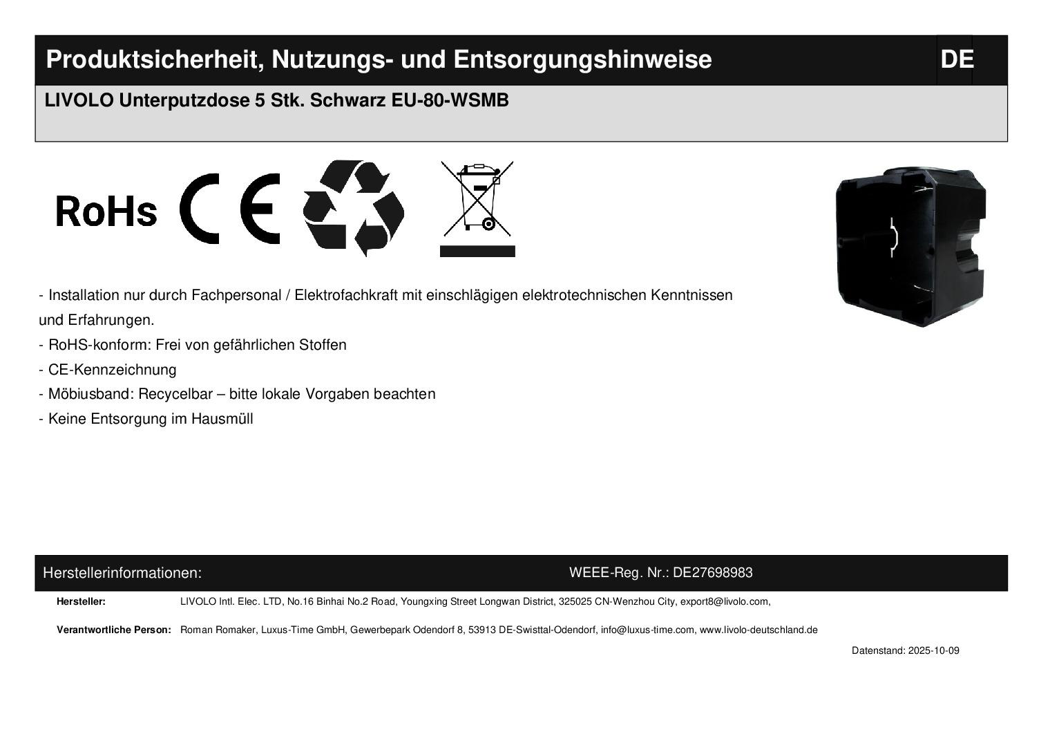 - Unterputzdosen, gemäß Bestellung Herstellerangaben:LIVOLO INTERNATIONAL ELECTRIC LTD