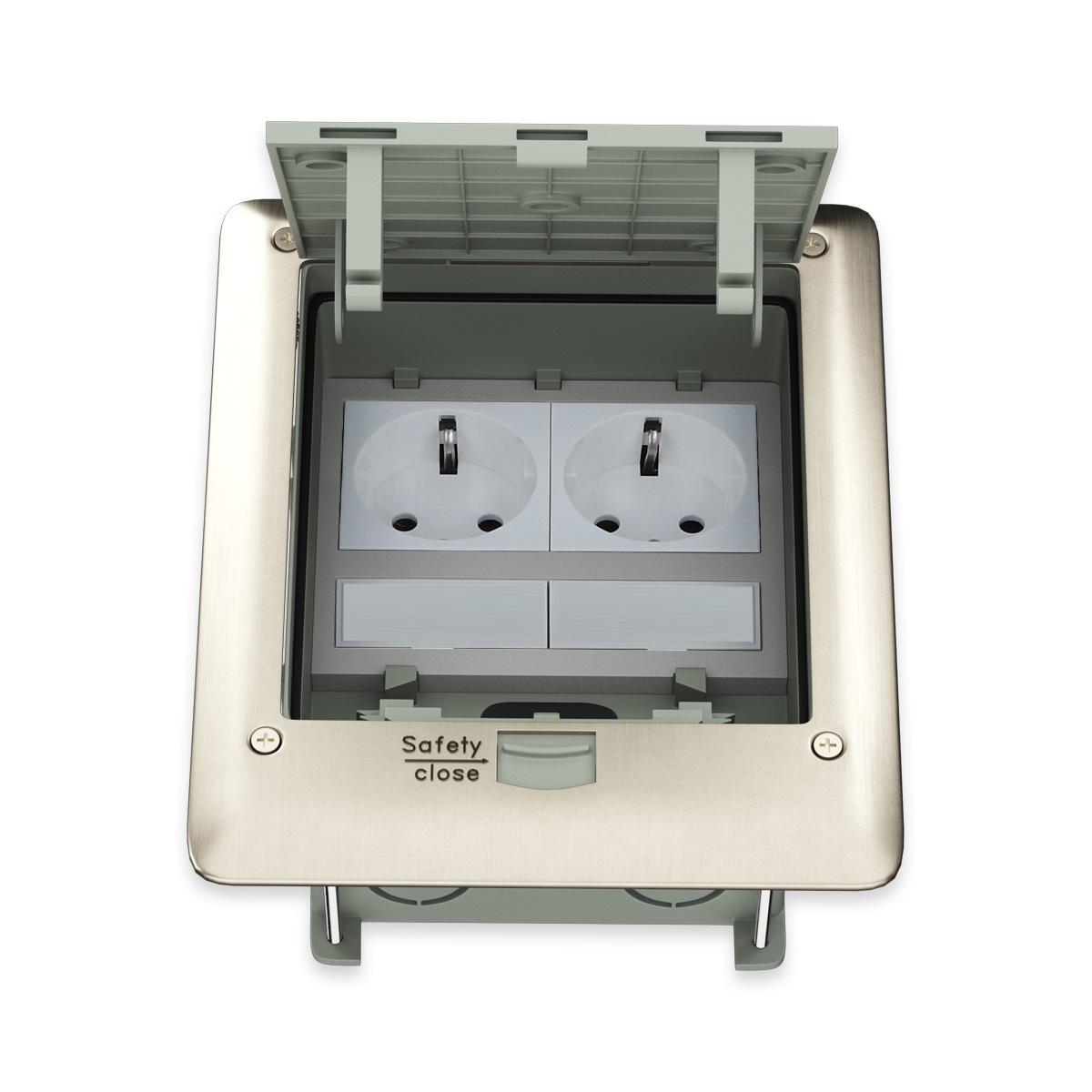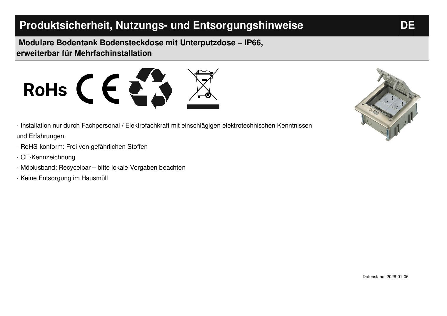 Erweiterbarer Bodentank Fußbodensteckdose Edelstahl mit zwei Steckdosen und zwei Blind-Blenden mit IP66 ZertifizierungDieser Bodentank mit Edelstahldeckel kann in trocken gepflegte Hohlböden und Estrichböden eingebaut werden. Der Bodentank kann beliebig durch weitere Bodentanks des selben Typs erweitert werden. Der Tank wird mit zwei weißen VDE Steckdosen-Modulen und zwei Blind-Blenden ausgeliefert. Optimal für den Einbau in Büros, Werkstätten, Garagen oder Verkaufsräumen. Dieser hochwertige Bodentank kann fast überall eingesetzt werden und kann auch überfahren werden. Er bietet auch im Alltag ein hohes Maß an Flexibilität, da bei Nichtgebrauch der Deckel komplett versenkt werden kann und somit sehr unauffällig ist. Der Deckel ist arretierbar und schließt sich somit nicht selbst, sollte dies nicht gewünscht sein. Für den Einbau in Estrich ist ein sogenannter Schutzdeckel nötig. Dieser ist im Lieferumfang enthalten. Optional kann eine Höhenerweiterung verwendet werden, sollte der Tank nicht hoch genug für den Bodenaufbau sein. Die Einsätze werden in den abschraubbaren Gerätebecher eingerastet und dann angeschlossen. Zum Schluss wird der Edelstahldeckel verschraubt. Technische Daten: