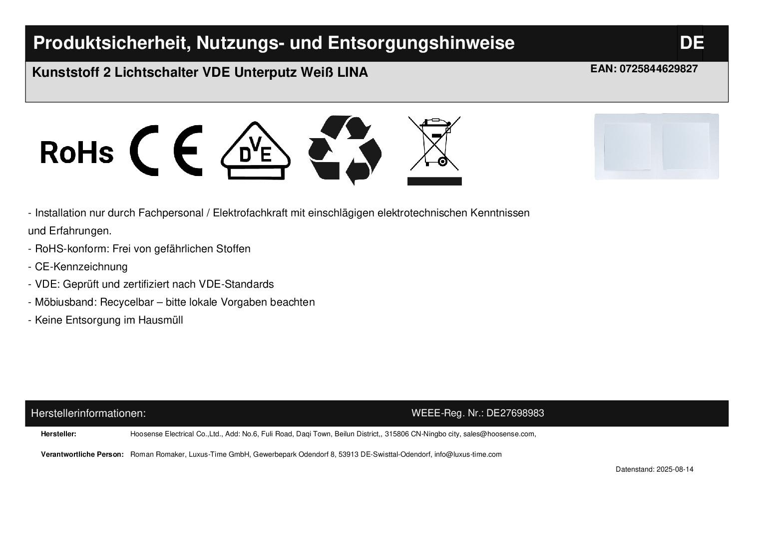 Titel: | Kunststoff 2 Lichtschalter VDE Unterputz Weiß LINA |