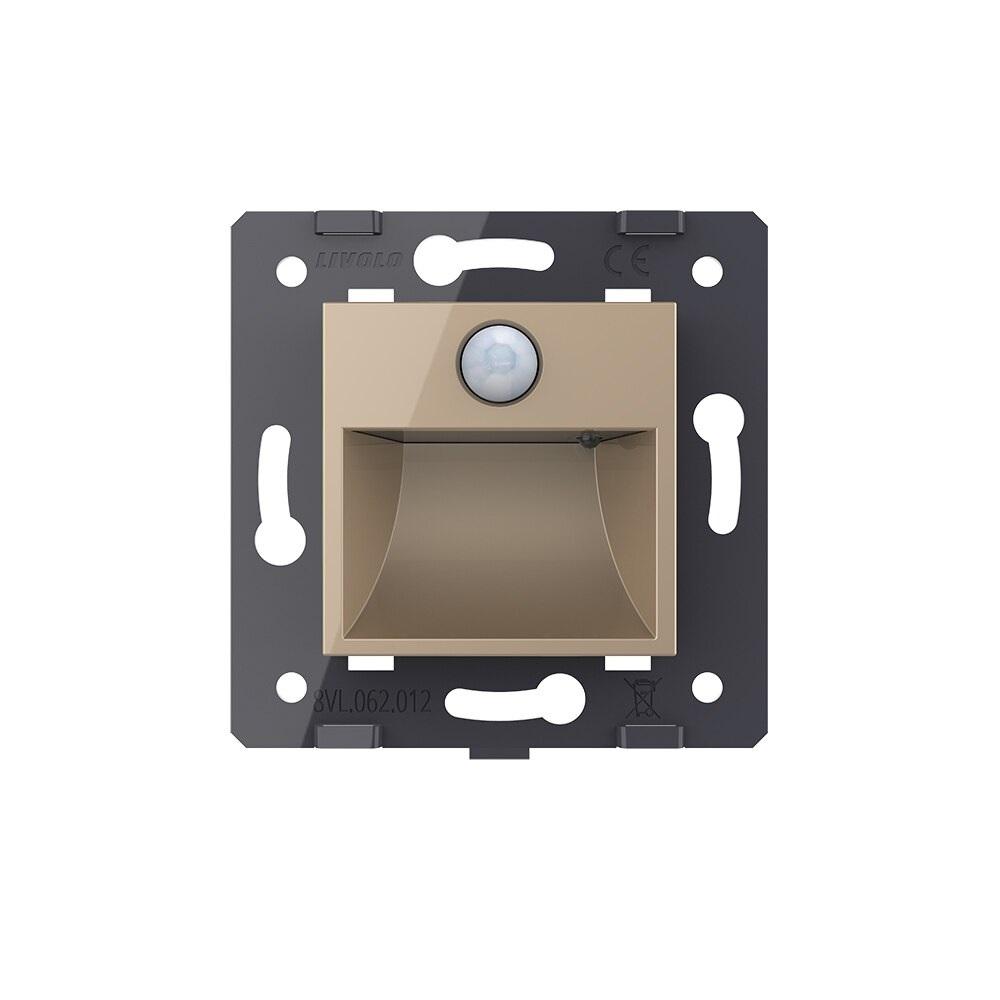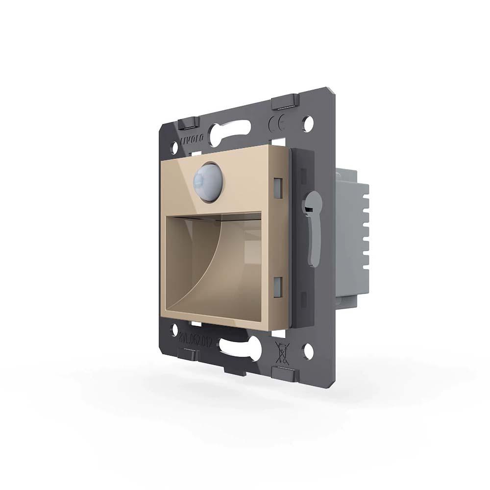 Livolo Treppenbeleuchtung Modul mit Bewegungsmelder in Gold Bitte beachten Sie, dass es sich bei diesem Angebot nur um ein Modul OHNE Glasblende handelt. Dies ist ein Livolo Treppenbeleuchtungs-Modul in Gold mit Bewegungsmelder. Die Treppenbeleuchtung eignet sich besonders für die Beleuchtung von Treppen und langen Fluren zur Orientierung im Dunkeln oder falls man das Licht nicht einschalten möchte. Durch den eingebauten Dämmerungssensor (nicht einstellbar) schaltet der Bewegungsmelder das Licht nur ein, wenn die Umgebung um den Bewegungsmelder dunkel genug ist. In Kombination mit der passenden Glasblende wird diese Treppenbeleuchtung zu einem echten Hingucker. Einfache und schnelle Montage, sowohl vertikal als auch horizontal . In unserem Shop finden Sie auch Spreizkrallen (LG-01) im 2er Pack, für Unterputzdosen ohne Verschraubungsmöglichkeit. Geeignet für Hohlwände und ältere Häuser (Baujahr vor 1970). Bei Verwendung von Spreizkrallen sind 68 mm große Unterputzdosen besser geeignet. Die Module werden mittels der beiliegenden Metallrahmen durch Schrauben an den Unterputzdosen befestigt. Der Austausch erfolgt wie bei anderen Wipp-Schalter-Herstellern. Ersetzen Sie einfach Ihre alten Wipp-Schalter durch ein neues, langlebiges Design. Die Verkabelung bleibt die gleiche. Die Lichtschalter- und Steckdosen-Module sind für Unterputzdosen mit 60-68 mm Durchmesser geeignet . Der Lochabstand für Mehrfach-Blenden beträgt 71 mm. Bei uns erhalten Sie die komplette Livolo Bandbreite; von einem einfachen Wipp-Lichtschalter bis zum smarthome-fähigen Touch-Rollladenschalter. Fragen? Rufen Sie uns an oder senden Sie uns eine E-Mail. Wir beraten Sie gerne! Technische Daten: Betriebsspannung: AC110~250V max. Leistung für jeden Gang 0.35W Ruhestromverbrauch: weniger als 0,1mW Beleuchtungszeit: 40 + 5 Sekunden Helligkeit: 4 Lux Lebensdauer über 100.000 Male Erfassungsabstands: 4 m Erfassungswinkel: 120 ° Abmessungen:71 x 71 x 35 mm Lieferumfang: Im Lieferumfang enthalten ist: - 1 x Livolo Innenleben Treppenbeleuchtung, gemäß Bestellung Achtung nur Innenleben! Passende Glasblenden finden Sie bei uns im Shop! Herstellerangaben:LIVOLO INTERNATIONAL ELECTRIC LTD