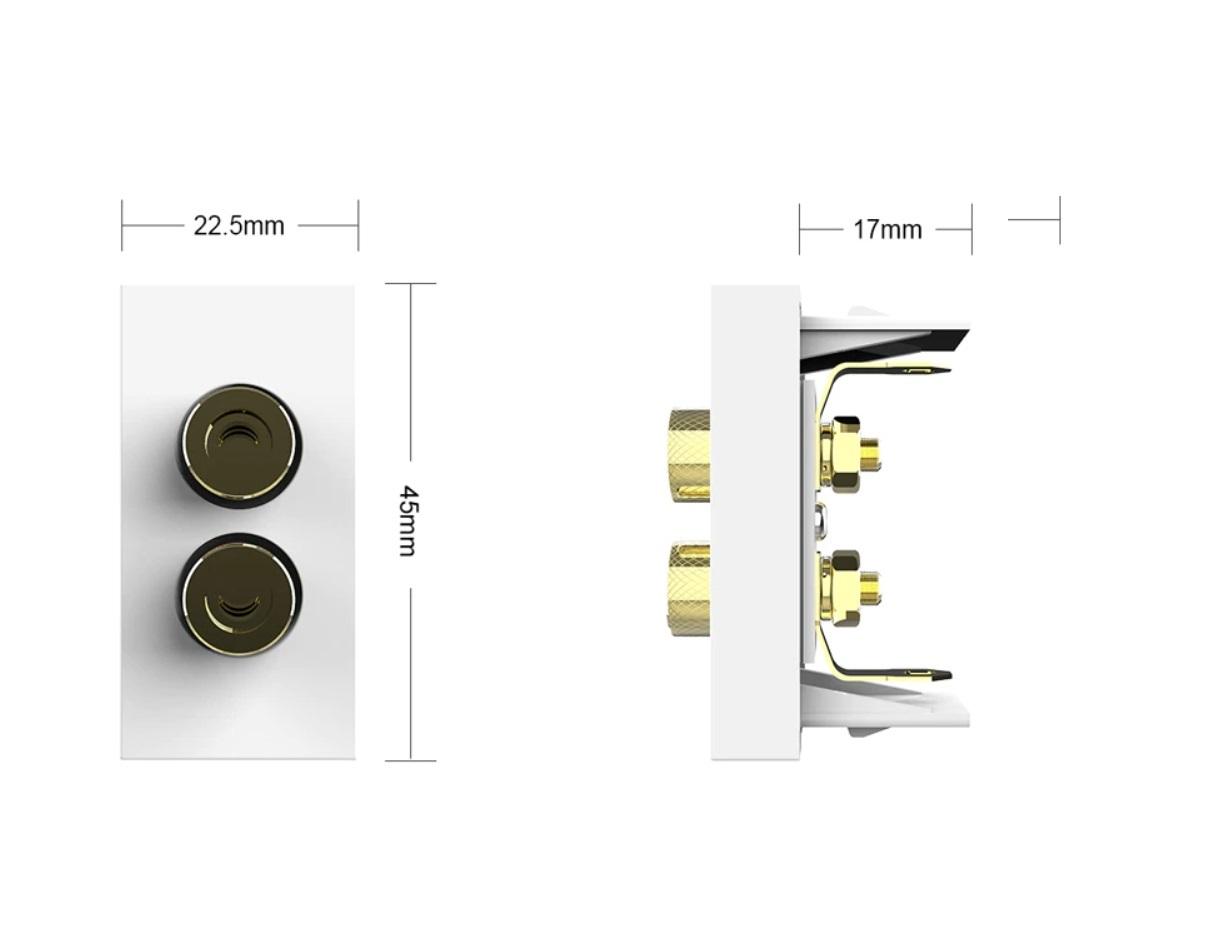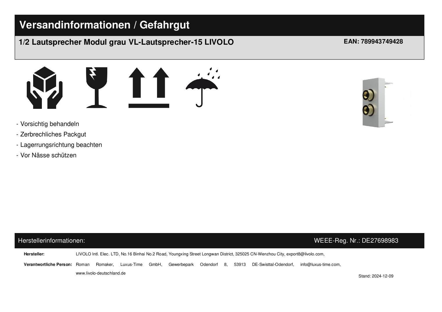 Livolo halbes Lautsprecher-Modul zum Schrauben in grauBitte beachten Sie, dass es sich bei diesem Angebot nur um ein Modul OHNE Glasblende handelt. Dies ist ein Livolo ½ Lautsprecher-Modul in grau, in das Sie die Kabel des Lautsprechers einschrauben können. So verbinden Sie Ihre HiFi-Anlage problemlos mit Ihren Lautsprechern ohne störende Kabel herumliegen zu haben. In Kombination mit der passenden Glasblende wird dieses Modul zu einem echten Hingucker. Bitte beachten Sie, dass Sie für den Einbau in eine Glasblende noch einen Metallrahmen benötigen . Einfache und schnelle Montage, sowohl vertikal als auch horizontal . Im unseren Shop finden Sie auch Spreizkrallen (LG-01) im 2er Pack, für Unterputzdosen ohne Verschraubungsmöglichkeit. Geeignet für Hohlwände und ältere Häuser (Baujahr vor 1970). Bei Verwendung von Spreizkrallen sind 68 mm große Unterputzdosen besser geeignet. Die Module werden mittels der beiliegenden Metallrahmen durch Schrauben an den Unterputzdosen befestigt. Der Austausch erfolgt wie bei anderen Wipp-Schalter-Herstellern. Ersetzen Sie einfach Ihre alten Wipp-Schalter durch ein neues, langlebiges Design. Die Verkabelung bleibt die gleiche. Die Lichtschalter- und Steckdosen-Module sind für Unterputzdosen mit 60-68 mm Durchmesser geeignet . Der Lochabstand für Mehrfach-Blenden beträgt 71 mm. Bei uns erhalten Sie die komplette Livolo Bandbreite; von einem einfachen Wipp-Lichtschalter bis zum smarthome-fähigen Touch-Rollladenschalter. Fragen? Rufen Sie uns an oder senden Sie uns eine E-Mail. Wir beraten Sie gerne! Abmessungen:71 x 71 x 27 mm Lieferumfang: Im Lieferumfang enthalten ist: - 1 x Livolo Innenleben Lautsprechermodul, gemäß Bestellung - Bedienungsanleitung Achtung nur Innenleben! Passende Glasblenden finden Sie bei uns im Shop! Herstellerangaben:LIVOLO INTERNATIONAL ELECTRIC LTD