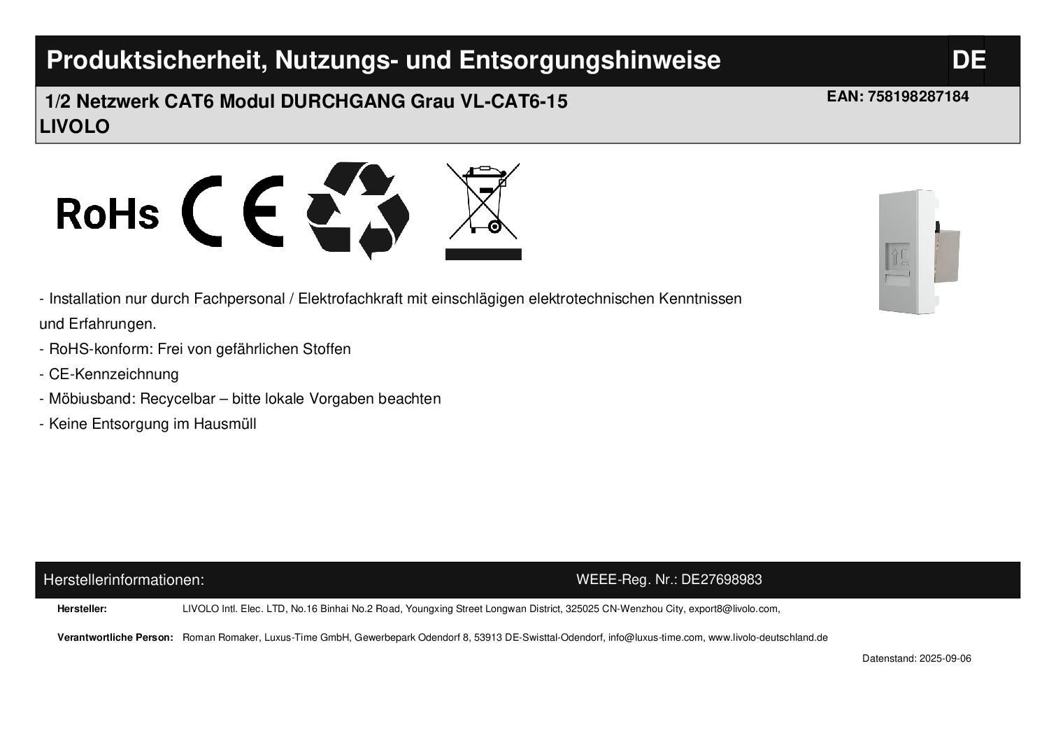 Lieferumfang:Im Lieferumfang enthalten ist: - 1 x Livolo Innenleben Netzwerk-Modul 1/2, gemäß Bestellung