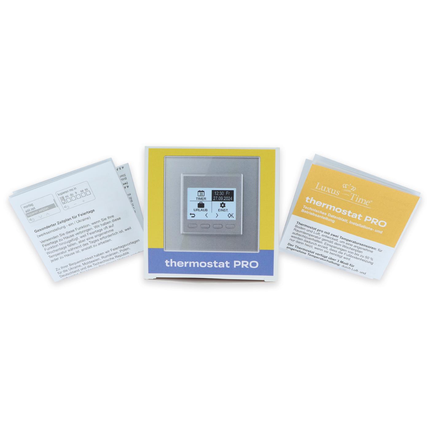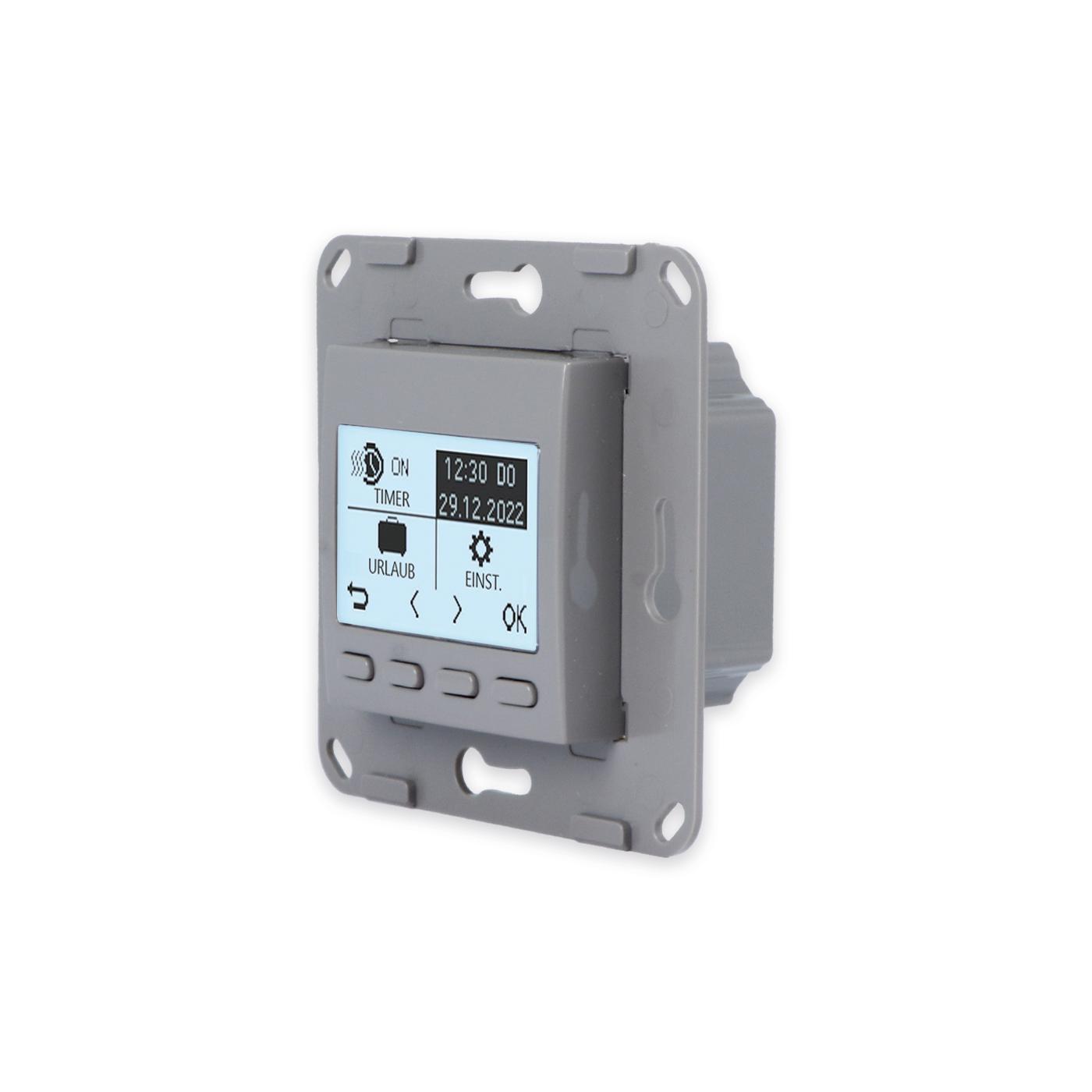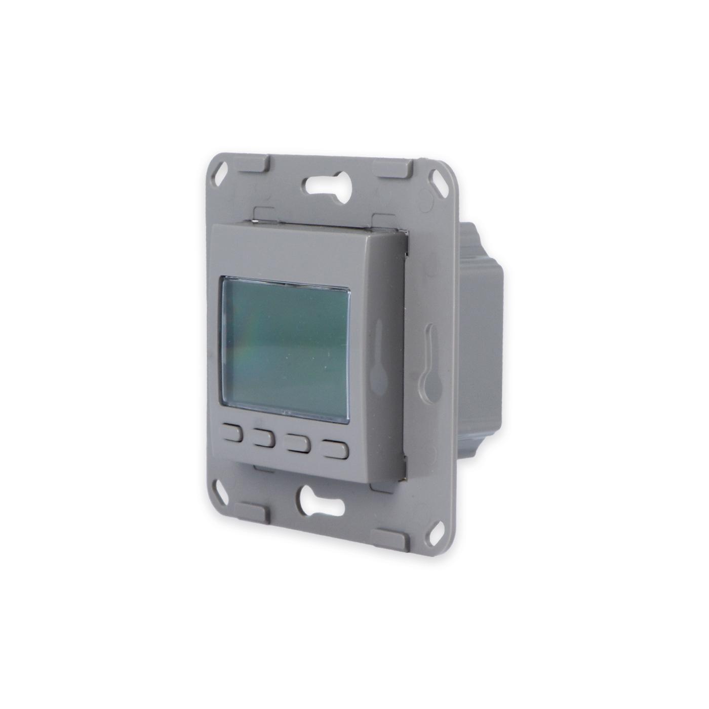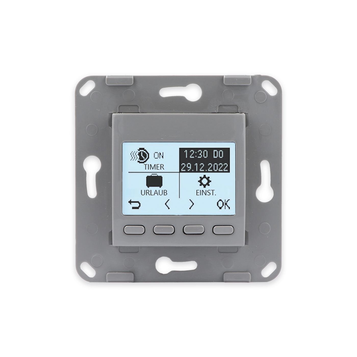 Livolo digitales Raumthermostat für Fußbodenheizungen Bitte beachten Sie, dass es sich bei diesem Angebot nur um ein Modul OHNE Glasblende handelt. Dies ist ein digitales Raumthermostat mit einem optionalen Bodenfühler von Livolo in Grau ( Achtung! Farbton leicht abweichend von anderen Livolo Modulen!). Mit diesem Thermostat können Sie die meisten Fußbodenheizungen mit Stellmotoren bedienen ( wasserführend oder elektrisch ), solange die Maximal-Leistung nicht überschritten wird. Über das Thermostat kann sowohl geheizt als auch gekühlt werden. Einstellbar ist das Thermostat über die Tasten auf der Vorderseite. Das Thermostat kann programmiert bzw. es können Zeitpläne mit Ausnahmen (wie z. B. Feiertage oder Urlaub) erstellt werden. Auch die Länge der Heizsaison kann eingestellt werden, sodass das Thermostat sich automatisch zu Beginn bzw. Ende der Heizsaison ein-/ ausschaltet . Das Display fällt nach einer gewissen Zeit in einen Standby-Modus , während die eingestellte Programmierung im Hintergrund weiter ausgeführt wird . Ebenfalls verfügt das Display über eine Kindersicherung bzw. Tastensperre. Um seine Heizkosten zu optimieren, können Statistiken zum Energieverbrauch aufgerufen werden. Es ist zusätzlich möglich auch seine aktuellen Preise zu hinterlegen um so einen noch genaueren Überblick zu behalten. Die "Fenster offen"- Funktion erkennt selbstständig, falls es einen starken Temperaturabfall geben sollte und fährt die Stellmotoren für eine gewisse Zeit herunter. Der mitgelieferte Bodenfühler kann optional angeschlossen werden. Falls es einen Stromausfall geben sollte, gibt es die Möglichkeit eine Batterie einzulegen, um alle Einstellungen gespeichert zu halten. In Kombination mit der passenden Glasblende wird dieses Raumthermostat zu einem echten Hingucker. Einfache und schnelle Montage in Livolo Glasrahmen ( Achtung! Nur horizontaler Einbau möglich!). In unserem Shop finden Sie auch Spreizkrallen (LG-01) im 2er Pack, für Unterputzdosen ohne Verschraubungsmöglichkeit. Geeignet für Hohlwände und ältere Häuser (Baujahr vor 1970). Bei Verwendung von Spreizkrallen sind 68 mm große Unterputzdosen besser geeignet. Das Modul wird mittels des eingebauten Rahmens durch Schrauben an der Unterputzdose befestigt. Ein Einbau ist nur horizontal möglich. Der Austausch erfolgt wie bei anderen Herstellern. Ersetzen Sie einfach Ihre alten Thermostate durch ein neues, langlebiges Design. Die Verkabelung bleibt die gleiche. Die Lichtschalter- und Steckdosen-Module sind für Unterputzdosen mit 60-68 mm Durchmesser geeignet . Der Lochabstand für Mehrfach-Blenden beträgt 71 mm. Wir empfehlen isolierte Unterputzdosen für genauere Messergebnisse. Bei uns erhalten Sie die komplette Livolo Bandbreite; von einem einfachen Wipp-Lichtschalter bis zum smarthome-fähigen Touch-Rollladenschalter. Fragen? Rufen Sie uns an oder senden Sie uns eine E-Mail. Wir beraten Sie gerne! Technische Daten: Abmessungen: 75 x 75 x 38,5mm Temperaturgenauigkeit: < 0,5°C Lebensdauer: > 50.000 Betätigungen (unter Last), > 20.000.000 (ohne Last) Anschlussspannung: 230V AC Schaltleistung: 16A Verfügbare Sprachen: Deutsch, Englisch, Russisch, Tschechisch, Ukrainisch Lieferumfang: Im Lieferumfang enthalten ist: - 1 x Livolo Raumthermostat programmierbar, gemäß Bestellung - 1 x Bodenfühler (optional Einbaubar) - Bedienungsanleitung Achtung nur Innenleben! Passende Glasblenden finden Sie bei uns im Shop! Herstellerangaben:DS Electronics Ltd.