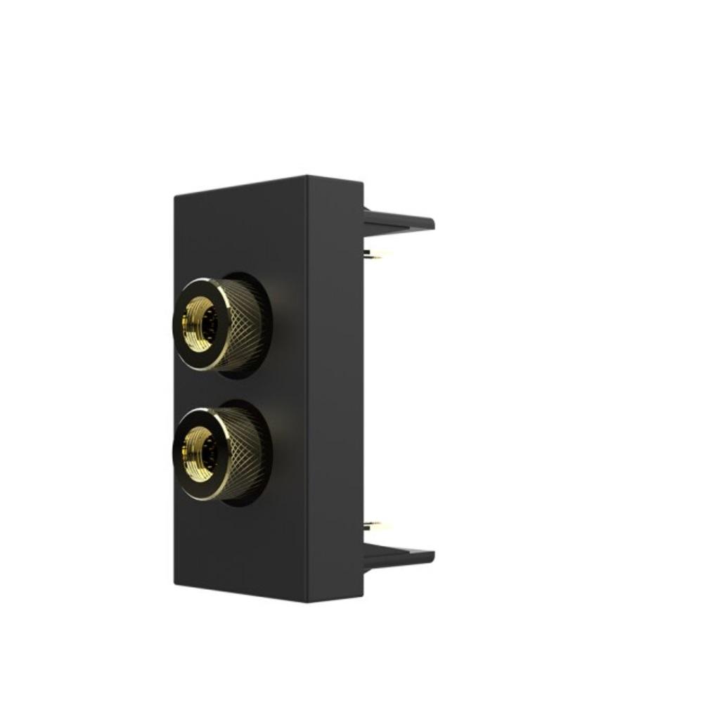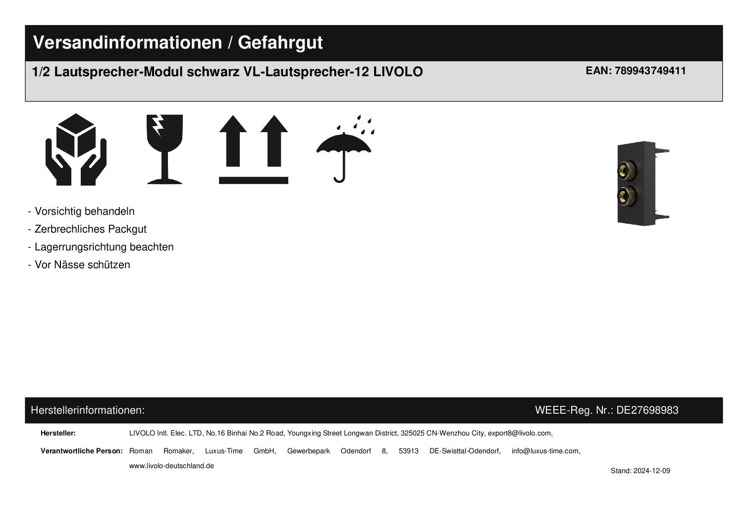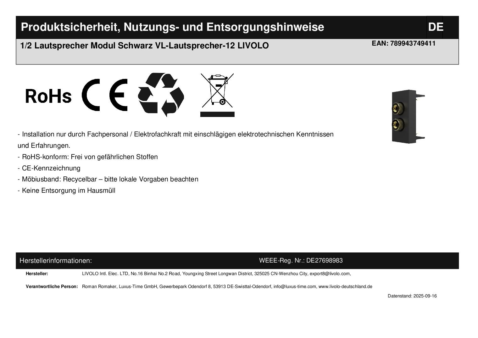 Livolo halbes Lautsprecher-Modul zum Schrauben in schwarzBitte beachten Sie, dass es sich bei diesem Angebot nur um ein Modul OHNE Glasblende handelt. Dies ist ein Livolo ½ Lautsprecher-Modul in schwarz, in das Sie die Kabel des Lautsprechers einschrauben können. So verbinden Sie Ihre HiFi-Anlage problemlos mit Ihren Lautsprechern ohne störende Kabel herumliegen zu haben. In Kombination mit der passenden Glasblende wird dieses Modul zu einem echten Hingucker. Bitte beachten Sie, dass Sie für den Einbau in eine Glasblende noch einen Metallrahmen benötigen . Einfache und schnelle Montage, sowohl vertikal als auch horizontal . Im unseren Shop finden Sie auch Spreizkrallen (LG-01) im 2er Pack, für Unterputzdosen ohne Verschraubungsmöglichkeit. Geeignet für Hohlwände und ältere Häuser (Baujahr vor 1970). Bei Verwendung von Spreizkrallen sind 68 mm große Unterputzdosen besser geeignet. Die Module werden mittels der beiliegenden Metallrahmen durch Schrauben an den Unterputzdosen befestigt. Der Austausch erfolgt wie bei anderen Wipp-Schalter-Herstellern. Ersetzen Sie einfach Ihre alten Wipp-Schalter durch ein neues, langlebiges Design. Die Verkabelung bleibt die gleiche. Die Lichtschalter- und Steckdosen-Module sind für Unterputzdosen mit 60-68 mm Durchmesser geeignet . Der Lochabstand für Mehrfach-Blenden beträgt 71 mm. Bei uns erhalten Sie die komplette Livolo Bandbreite; von einem einfachen Wipp-Lichtschalter bis zum smarthome-fähigen Touch-Rollladenschalter. Fragen? Rufen Sie uns an oder senden Sie uns eine E-Mail. Wir beraten Sie gerne! Abmessungen:71 x 71 x 27 mm Lieferumfang: Im Lieferumfang enthalten ist: - 1 x Livolo Innenleben Lautsprechermodul, gemäß Bestellung - Bedienungsanleitung Achtung nur Innenleben! Passende Glasblenden finden Sie bei uns im Shop! Herstellerangaben:LIVOLO INTERNATIONAL ELECTRIC LTD