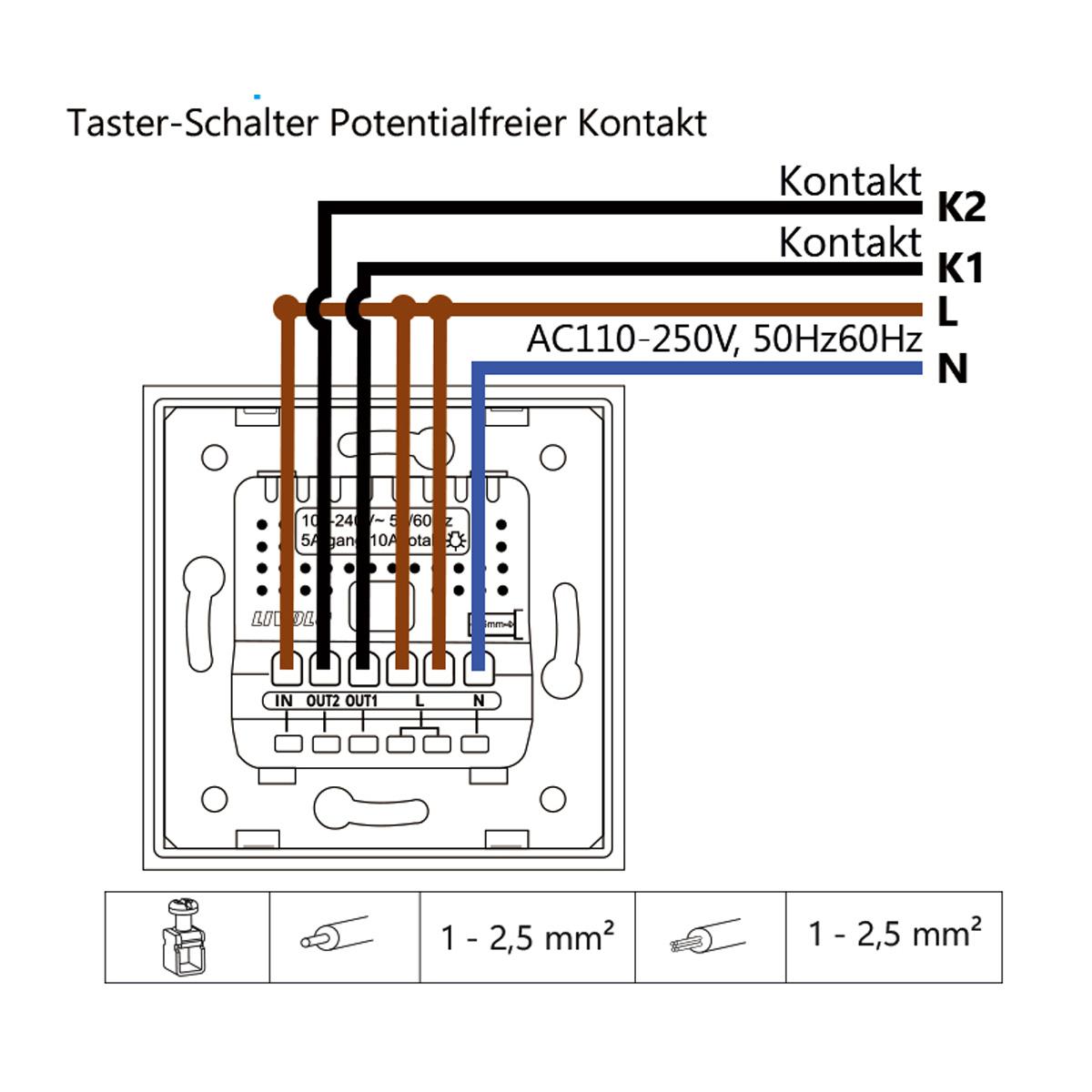 Livolo einfaches Taster-Modul für Haus-Automation VL-701IH / VL-FC1NB Bitte beachten Sie, dass es sich bei diesem Angebot nur um ein Modul OHNE Glasblende handelt. Dieser Tastertyp ist hauptsächlich für den Einsatz mit intelligenten Systemen konzipiert, die SmartHome-Systeme erfordern. Das sogenannte "Trockenkontaktrelais" ist bei den meisten dieser Systeme Pflicht. Mit dieser Art von Impulsschalter können Sie 12 V, 24 V, 115 V oder 230 V schalten. Der Kontakttaster LIVOLO C701IH mit einem potentialfreien Kontakt benötigt eine Versorgungsspannung von 230 V AC sowie einen Nullleiter N. Der Taster arbeitet im Klingelmodus, der Ausgangskontakt verbindet sich (aktiv) nur bei Berührung des Sensors. Mit der Taste können Sie einen einzelnen, doppelten oder mehrfachen Impuls und lange Haltezeit ausführen, um verschiedene intelligente Funktionen Ihres intelligenten Kabelsystems zuzuweisen. In Kombination mit der passenden Glasblende wird dieser Taster mit moderner Sensortechnik zu einem echten Hingucker. Unsere Touch- Lichtschalter können mit allen Arten von Lampen verwendet werden , einschließlich Glühlampen, Halogenlampen & Energiesparlampen, da die Steuerung über das Relais läuft.