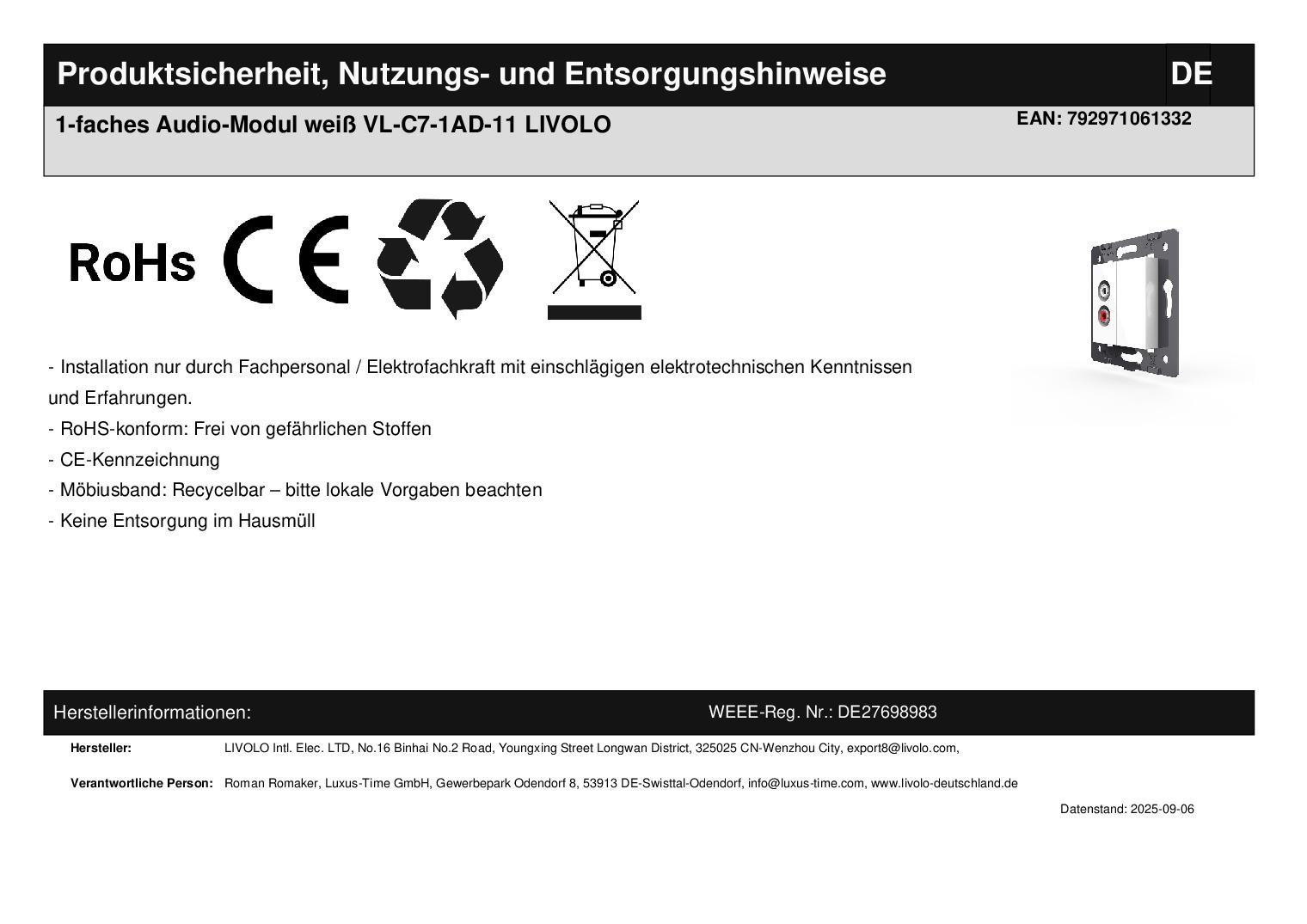 - 1 x Livolo Innenleben Audio-Modul einfach, gemäß Bestellung - Bedienungsanleitung