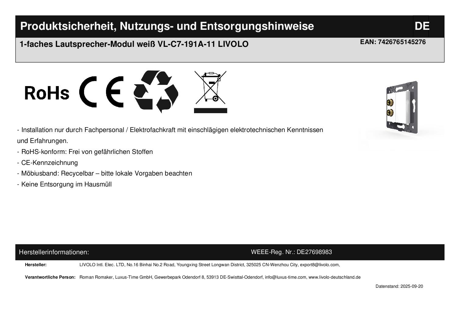 - 1 x Livolo Innenleben Lautsprechermodul einfach, gemäß Bestellung