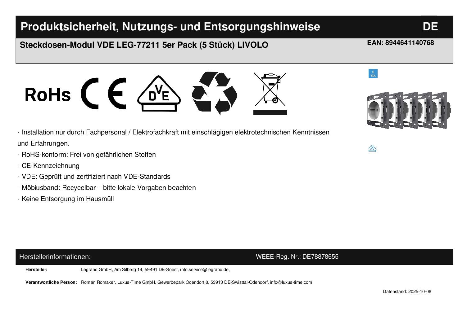 - 5 x Livolo Innenleben Steckdose VDE, gemäß Bestellung