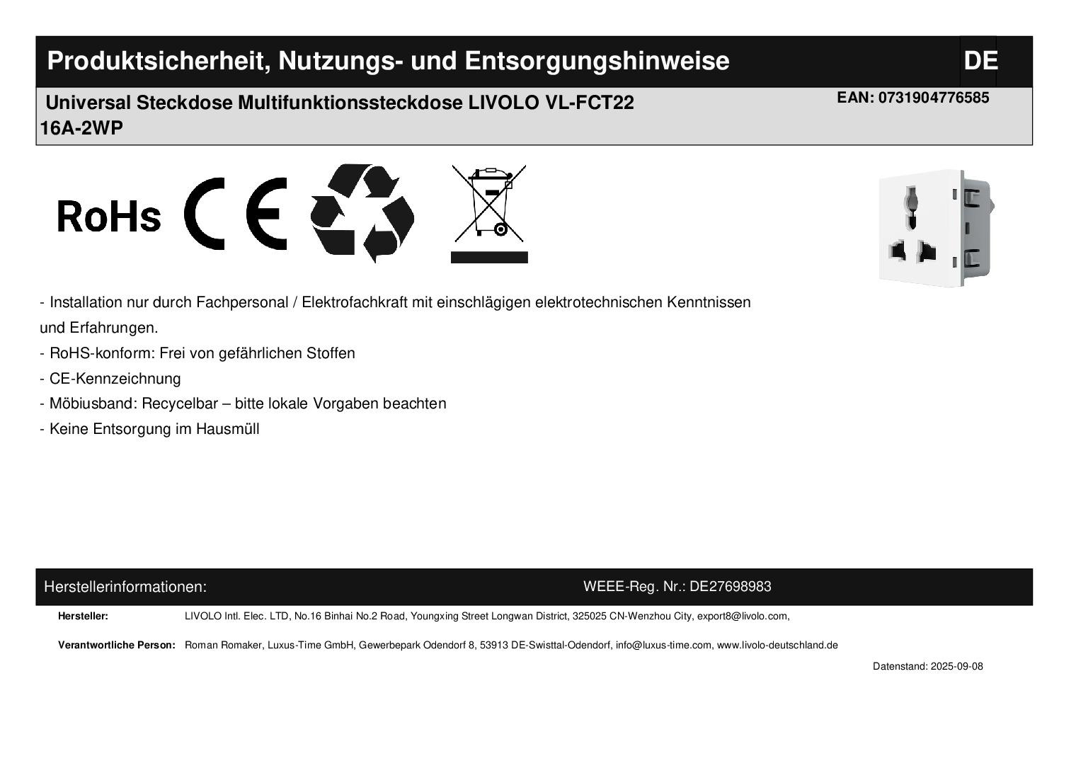 Achtung nur Innenleben! Passende Glasblenden finden Sie bei uns im Shop! Herstellerangaben:LIVOLO INTERNATIONAL ELECTRIC LTD
