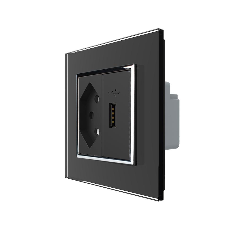 Dies ist eine Schweizer Steckdose zusammen mit einem USB Modul inkl. Glasrahmen in schwarz.