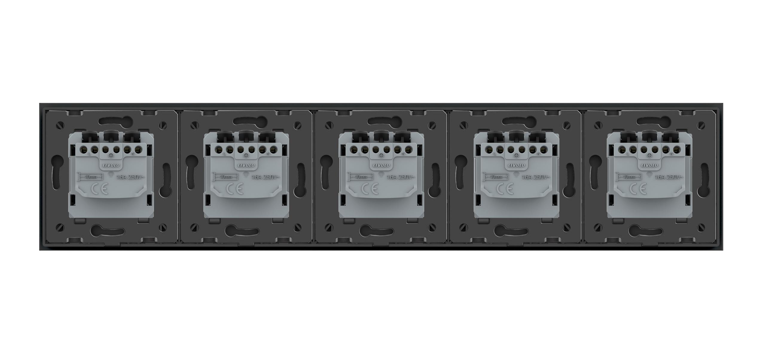 Livolo Kombination fünf Steckdosen-Module mit 5-fach Glasblende in schwarz Dies sind fünf einfache Livolo Steckdosen-Module in schwarz und einer 5-fachen Glasblende. Die Steckdosen verfügen über eine eingebaute Kindersicherung . Durch die Glasblende wird diese Steckdose zu einem echten Hingucker. Einfache und schnelle Montage, sowohl vertikal als auch horizontal . Im unseren Shop finden Sie auch Spreizkrallen (LG-01) im 2er Pack, für Unterputzdosen ohne Verschraubungsmöglichkeit. Geeignet für Hohlwände und ältere Häuser (Baujahr vor 1970). Bei Verwendung von Spreizkrallen sind 68 mm große Unterputzdosen besser geeignet. Die Module werden mittels der beiliegenden Metallrahmen durch Schrauben an den Unterputzdosen befestigt. Der Austausch erfolgt wie bei anderen Wipp-Schalter-Herstellern. Ersetzen Sie einfach Ihre alten Wipp-Schalter durch ein neues, langlebiges Design. Die Verkabelung bleibt die gleiche. Die Lichtschalter- und Steckdosen-Module sind für Unterputzdosen mit 60-68 mm Durchmesser geeignet . Der Lochabstand für Mehrfach-Blenden beträgt 71 mm. Bei uns erhalten Sie die komplette Livolo Bandbreite; von einem einfachen Wipp-Lichtschalter bis zum smarthome-fähigen Touch-Rollladenschalter. Fragen? Rufen Sie uns an oder senden Sie uns eine E-Mail. Wir beraten Sie gerne! Technische Daten: Nennstrom/Spannung: 16A/250V Abmessungen:365 x 80 x 33 mm Lieferumfang: Im Lieferumfang enthalten ist: