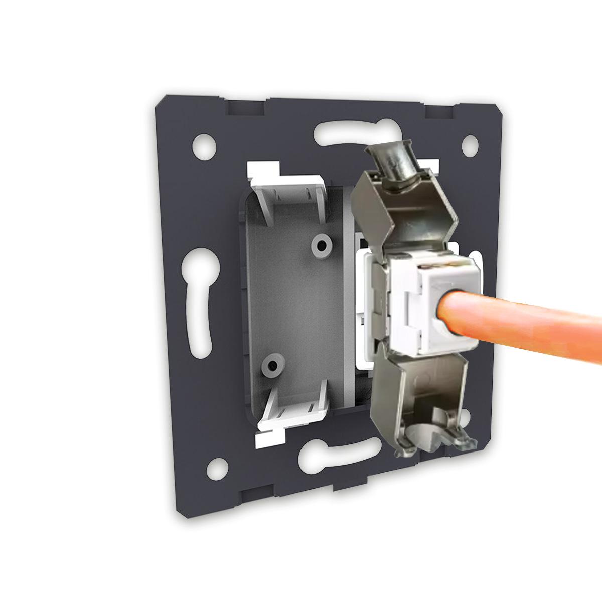 Dies ist ein einfaches Livolo LAN-Modul RJ45 in weiß mit Glasblende. Es handelt sich um ein CAT6A Modul, mit dem Sie z. B. smarte Geräte mit dem Router über einen stabilen, kabelgebundenen Anschluss verbinden können.