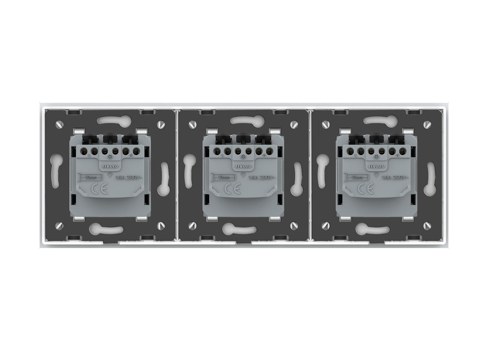 Livolo Kombination drei Steckdosen-Module mit 3-fach Glasblende in komplett weiß Dies sind drei einfache Livolo Steckdosen-Module in weiß mit einer 3-fachen Glasblende. Die Steckdosen verfügen über eine eingebaute Kindersicherung . Durch die Glasblende wird diese Steckdose zu einem echten Hingucker. Einfache und schnelle Montage, sowohl vertikal als auch horizontal . Im unseren Shop finden Sie auch Spreizkrallen (LG-01) im 2er Pack, für Unterputzdosen ohne Verschraubungsmöglichkeit. Geeignet für Hohlwände und ältere Häuser (Baujahr vor 1970). Bei Verwendung von Spreizkrallen sind 68 mm große Unterputzdosen besser geeignet. Die Module werden mittels der beiliegenden Metallrahmen durch Schrauben an den Unterputzdosen befestigt. Der Austausch erfolgt wie bei anderen Wipp-Schalter-Herstellern. Ersetzen Sie einfach Ihre alten Wipp-Schalter durch ein neues, langlebiges Design. Die Verkabelung bleibt die gleiche. Die Lichtschalter- und Steckdosen-Module sind für Unterputzdosen mit 60-68 mm Durchmesser geeignet . Der Lochabstand für Mehrfach-Blenden beträgt 71 mm. Bei uns erhalten Sie die komplette Livolo Bandbreite; von einem einfachen Wipp-Lichtschalter bis zum smarthome-fähigen Touch-Rollladenschalter. Fragen? Rufen Sie uns an oder senden Sie uns eine E-Mail. Wir beraten Sie gerne! Technische Daten: Nennstrom/Spannung: 16A/250V Abmessungen:222 x 80 x 33 mm Lieferumfang: Im Lieferumfang enthalten ist: