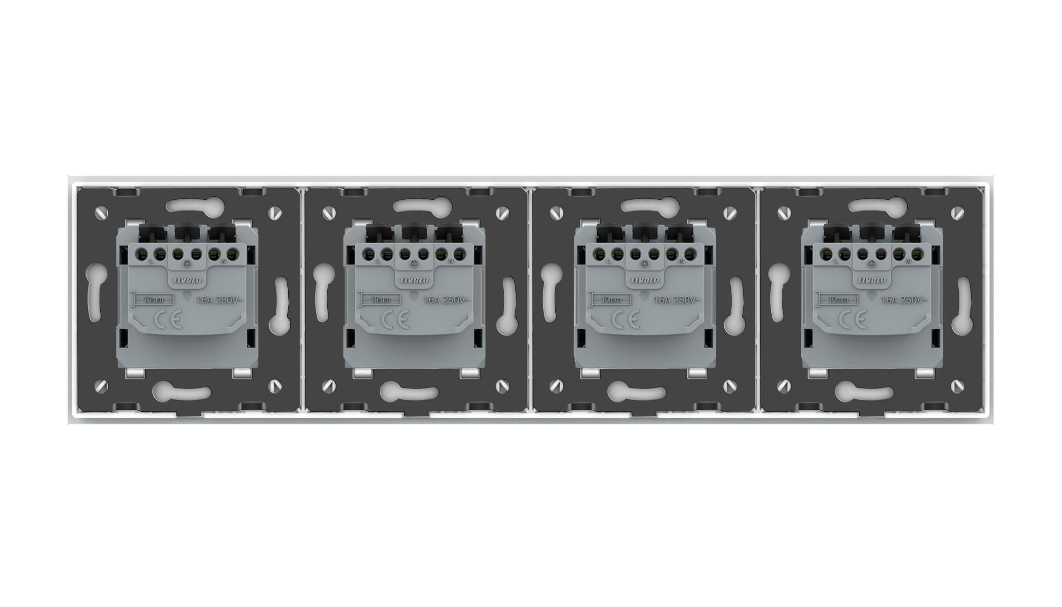 Dies sind vier einfache Livolo Steckdosen-Module in weiß mit einer 4-fachen Glasblende.