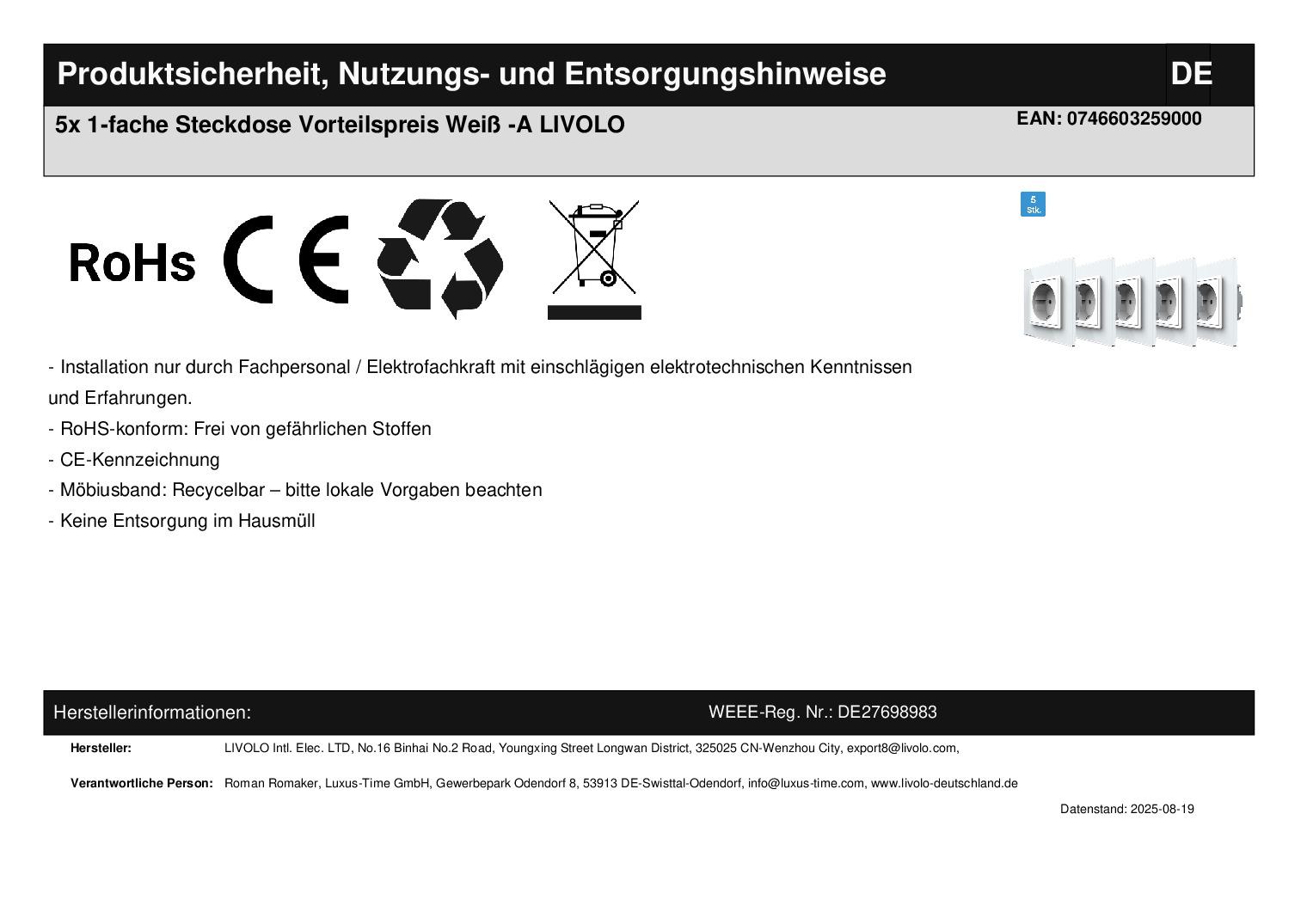 - 5 x Livolo Innenleben Steckdose, gemäß Bestellung