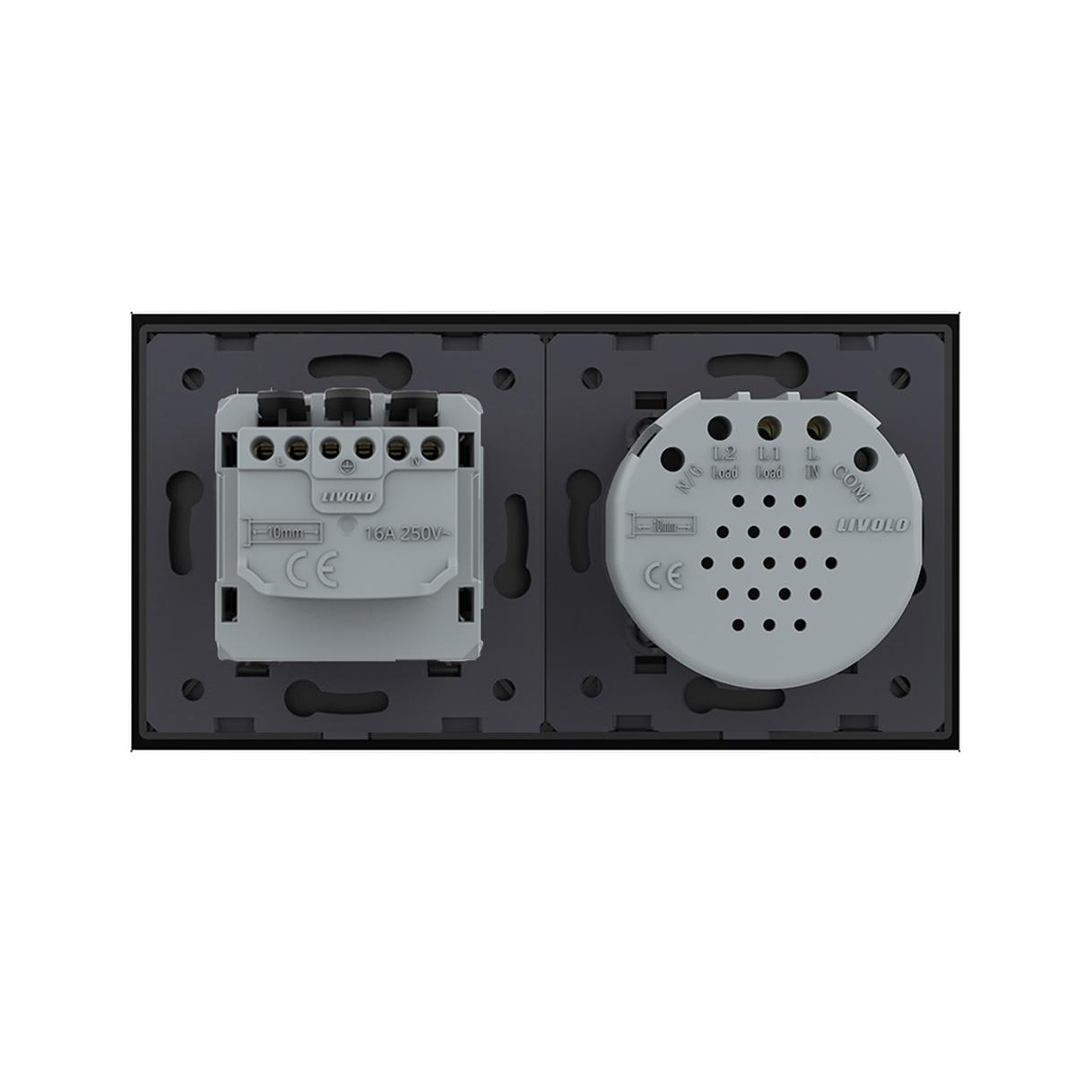 Livolo Kombination Lichtschalter- und Steckdosen-Modul mit 2-fach Glasblende in schwarzDies ist ein einfacher Livolo Lichtschalter, zum ein- und ausschalten einer Leuchte bzw. Leuchtengruppe inkl. Glasblende. Die Steckdose verfügt über eine eingebaute Kindersicherung. Durch die Glasblende wird dieser Schalter mit moderner Sensortechnik zu einem echten Hingucker. Einfache und schnelle Montage, sowohl vertikal als auch horizontal . Durch leichtes Berühren der Kreisfläche wird der Lichtschalter betätigt. Die Kontur der Berührungsfläche ist dezent beleuchtet , so dass eine einfache Bedienung zu jeder Tageszeit möglich ist. Vor allem im Dunkeln ist es einfach den Schalter zu finden. Im An-Modus leuchtet die Umrandung des Touchfeldes Rot, im Aus-Modus Blau. Unsere Touch- Lichtschalter können mit allen Arten von Lampen verwendet werden , einschließlich Glühlampen, Halogenlampen & Energiesparlampen. Ausnahme : LED-Strips. Achtung: Bei Leuchten unter 20 Watt (besonders LED-Leuchten) kann es zu Störungen kommen. In diesem Fall hilft in fast allen Fällen ein Widerstandsadapter . Bei unseren LED Deckenspots benötigen Sie keinen Widerstandsadapter! Die LED Deckenspots sind kompatibel mit allen unseren Livolo Schaltern. Im unseren Shop finden Sie auch Spreizkrallen (LG-01) im 2er Pack, für Unterputzdosen ohne Verschraubungsmöglichkeit. Geeignet für Hohlwände und ältere Häuser (Baujahr vor 1970). Bei Verwendung von Spreizkrallen sind 68 mm große Unterputzdosen besser geeignet. Die Module werden mittels der beiliegenden Metallrahmen durch Schrauben an den Unterputzdosen befestigt. Der Austausch erfolgt wie bei anderen Wipp-Schalter-Herstellern. Ersetzen Sie einfach Ihre alten Wipp-Schalter durch ein neues, langlebiges Design. Die Verkabelung bleibt die gleiche. Die Lichtschalter- und Steckdosen-Module sind für Unterputzdosen mit 60-68 mm Durchmesser geeignet . Der Lochabstand für Mehrfach-Blenden beträgt 71 mm. Bei uns erhalten Sie die komplette Livolo Bandbreite; von einem einfachen Wipp-Lichtschalter bis zum smarthome-fähigen Touch-Rollladenschalter. Fragen? Rufen Sie uns an oder senden Sie uns eine E-Mail. Wir beraten Sie gerne! Technische Daten: Lichtschalter: Betriebsspannung: AC220~250V, 50Hz60Hz max. elektrische Spannung: 5A Stromlast: 3W~1000W Ruhestromverbrauch: weniger als 0,1mW Lebensdauer über 100.000 Male Steckdose: Nennstrom/Spannung: 16A/250V Abmessungen:151 x 80 x 34 mm Lieferumfang: Im Lieferumfang enthalten ist:
