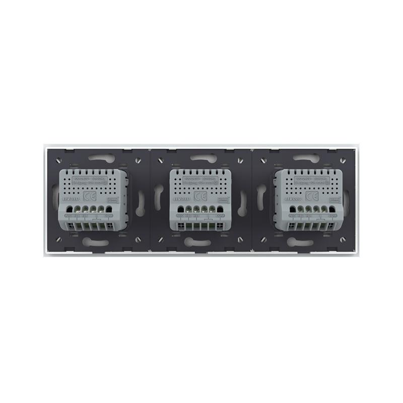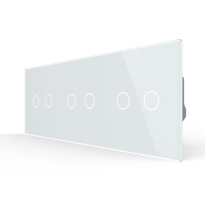 Livolo 3 Rollladenschalter-Module mit Glasblende in WeißDies sind drei Livolo Rollladenschalter, zum hoch- und runterfahren sowie pausieren einer Rolllade, einer Markise, eines Raffstores oder einer Jalousie. Der Schalter kann auch durch den Einsatz des Moduls WRC01 per App gesteuert werden. Durch die Glasblende wird diese Kombination mit moderner Sensortechnik zu einem echten Hingucker. Einfache und schnelle Montage, sowohl vertikal als auch horizontal . Durch leichtes Berühren der Kreisfläche wird der Rollladenschalter betätigt. Die Kontur der Berührungsfläche ist dezent beleuchtet , so dass eine einfache Bedienung zu jeder Tageszeit möglich ist. Vor allem im Dunkeln ist es einfach den Schalter zu finden. Im An-Modus leuchtet die Umrandung des Touchfeldes Rot, im Aus-Modus Blau. Durch ein weiteres Betätigen des Schalters können Sie den Rollladenmotor stoppen. Im unseren Shop finden Sie auch Spreizkrallen (LG-01) im 2er Pack, für Unterputzdosen ohne Verschraubungsmöglichkeit. Geeignet für Hohlwände und ältere Häuser (Baujahr vor 1970). Bei Verwendung von Spreizkrallen sind 68 mm große Unterputzdosen besser geeignet. Die Module werden mittels der beiliegenden Metallrahmen durch Schrauben an den Unterputzdosen befestigt. Der Austausch erfolgt wie bei anderen Rollladenschalter-Herstellern. Ersetzen Sie einfach Ihre alten Schalter durch ein neues, langlebiges Design. Die Verkabelung bleibt die gleiche. Unsere Module sind für Unterputzdosen mit 60-68 mm Durchmesser geeignet . Der Lochabstand für Mehrfach-Blenden beträgt 71 mm. Bei uns erhalten Sie die komplette Livolo Bandbreite; von einem einfachen Wipp-Lichtschalter bis zum smarthome-fähigen Touch-Rollladenschalter. Fragen? Rufen Sie uns an oder senden Sie uns eine E-Mail. Wir beraten Sie gerne! Technische Daten: Betriebsspannung: AC 220V-250V Stromstärke: 5A Stromlast: 2000W Lebensdauer über 100.000 Male Fahrzeit: ca. 60 Sekunden Abmessungen:222 x 80 x 34 mm Lieferumfang: Im Lieferumfang enthalten ist: