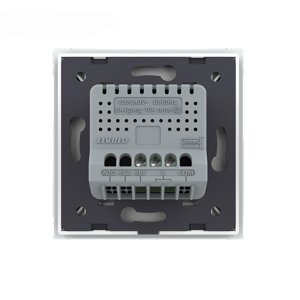 Livolo Rollladenschalter-Modul mit Glasblende in weißDies ist ein Livolo Rollladenschalter, zum hoch- und runterfahren sowie pausieren einer Rolllade, einer Markise, eines Raffstores oder einer Jalousie. Der Schalter kann auch durch den Einsatz des Moduls WRC01 per App gesteuert werden. Durch die Glasblende wird dieser Schalter mit moderner Sensortechnik zu einem echten Hingucker. Einfache und schnelle Montage, sowohl vertikal als auch horizontal . Durch leichtes Berühren der Kreisfläche wird der Rollladenschalter betätigt. Die Kontur der Berührungsfläche ist dezent beleuchtet , so dass eine einfache Bedienung zu jeder Tageszeit möglich ist. Vor allem im Dunkeln ist es einfach den Schalter zu finden. Im An-Modus leuchtet die Umrandung des Touchfeldes Rot, im Aus-Modus Blau. Durch ein weiteres Betätigen des Schalters können Sie den Rollladenmotor stoppen. In unserem Shop finden Sie auch Spreizkrallen (LG-01) im 2er Pack, für Unterputzdosen ohne Verschraubungsmöglichkeit. Geeignet für Hohlwände und ältere Häuser (Baujahr vor 1970). Bei Verwendung von Spreizkrallen sind 68 mm große Unterputzdosen besser geeignet. Die Module werden mittels der beiliegenden Metallrahmen durch Schrauben an den Unterputzdosen befestigt. Der Austausch erfolgt wie bei anderen Wipp-Schalter-Herstellern. Ersetzen Sie einfach Ihre alten Wipp-Schalter durch ein neues, langlebiges Design. Die Verkabelung bleibt die gleiche. Die Lichtschalter- und Steckdosen-Module sind für Unterputzdosen mit 60-68 mm Durchmesser geeignet . Der Lochabstand für Mehrfach-Blenden beträgt 71 mm. Bei uns erhalten Sie die komplette Livolo Bandbreite; von einem einfachen Wipp-Lichtschalter bis zum smarthome-fähigen Touch-Rollladenschalter. Fragen? Rufen Sie uns an oder senden Sie uns eine E-Mail. Wir beraten Sie gerne! Technische Daten: Betriebsspannung: AC 220V-250V Stromstärke: 5A Stromlast: 2000W Lebensdauer über 100.000 Male Abmessungen:80 x 80 x 34 mm Lieferumfang: Im Lieferumfang enthalten ist: