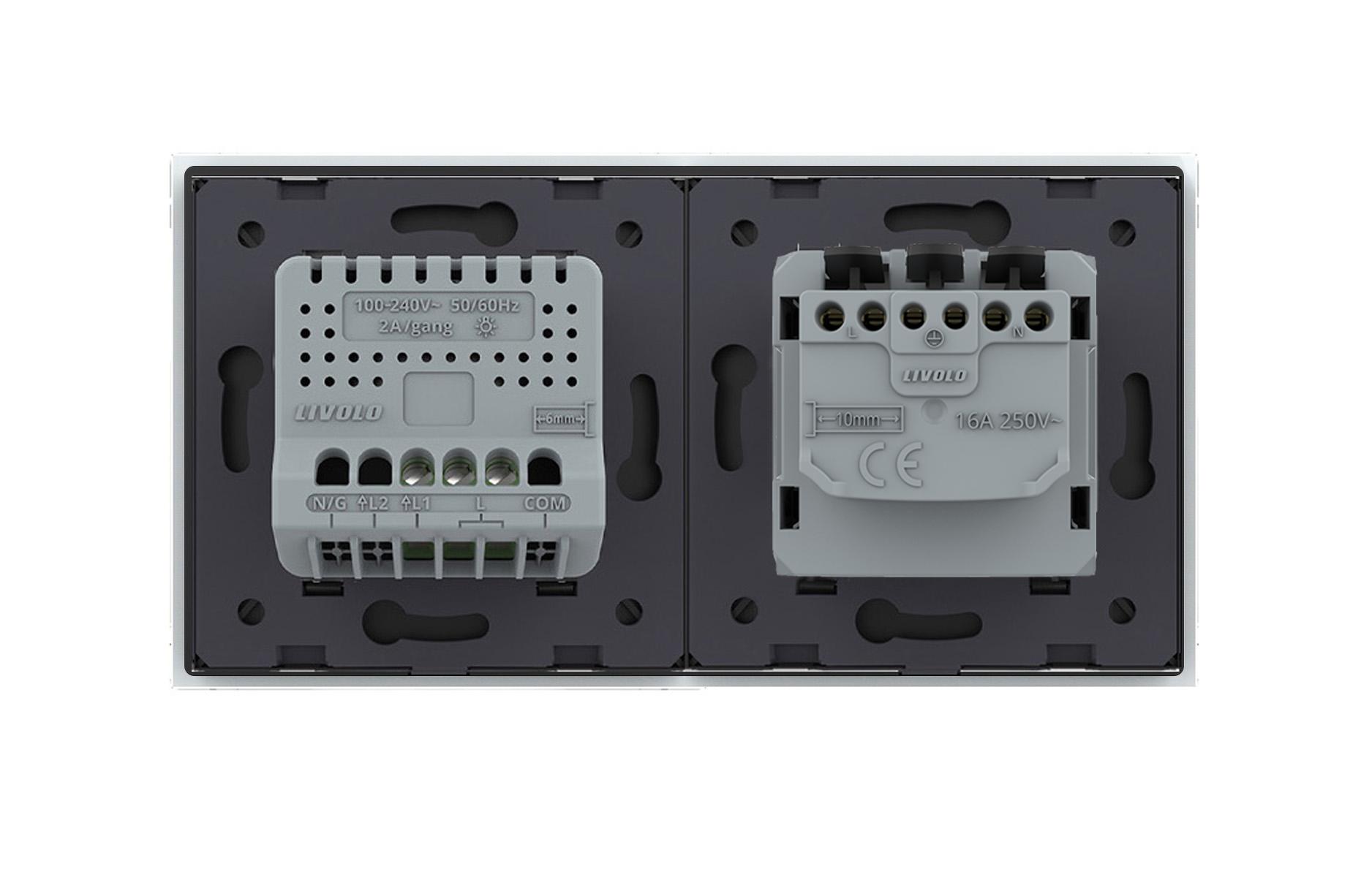 Livolo Kombination Wechsel-/Kreuzschalter- und Steckdosen-Modul mit 2-fach Glasblende in weißDies ist ein einfacher Livolo Wechselschalter, zum ein- und ausschalten einer Leuchte bzw. Leuchtengruppe. Zusätzlich verfügt es über eine Wechselschalt-Funktion, sodass die Leuchte von bis zu vier Schaltern aus ein- und ausgeschaltet werden kann. Die Livolo Touch-Wechselschalter können gleichzeitig auch als Kreuzschalter verwendet werden. Der Anschluss aller korrespondierender Kabel der weiteren Touch-Wechselschalter erfolgt zusammen im COM-Anschluss des Schalters, der als Kreuzschalter verwendet wird. Da im Anschluss eine Synchronisation ( YouTube-Video ) erfolgen muss, können innerhalb einer Wechselschaltung nur Livolo Touch-Wechselschalter verwendet werden. Die Synchronisationsanleitung finden Sie in der Bedienungsanleitung. Die Steckdose verfügt über eine eingebaute Kindersicherung. Durch die Glasblende wird dieser Schalter mit moderner Sensortechnik zu einem echten Hingucker. Einfache und schnelle Montage, sowohl vertikal als auch horizontal . Durch leichtes Berühren der Kreisfläche wird der Lichtschalter betätigt. Die Kontur der Berührungsfläche ist dezent beleuchtet , so dass eine einfache Bedienung zu jeder Tageszeit möglich ist. Vor allem im Dunkeln ist es einfach den Schalter zu finden. Im An-Modus leuchtet die Umrandung des Touchfeldes Rot, im Aus-Modus Blau. Unsere Touch- Lichtschalter können mit allen Arten von Lampen verwendet werden , einschließlich Glühlampen, Halogenlampen & Energiesparlampen. Ausnahme : LED-Strips. Achtung: Bei Leuchten unter 20 Watt (besonders LED-Leuchten) kann es zu Störungen kommen. In diesem Fall hilft in fast allen Fällen ein Widerstandsadapter . Bei unseren LED Deckenspots benötigen Sie keinen Widerstandsadapter! Die LED Deckenspots sind kompatibel mit allen unseren Livolo Schaltern. Im unseren Shop finden Sie auch Spreizkrallen (LG-01) im 2er Pack, für Unterputzdosen ohne Verschraubungsmöglichkeit. Geeignet für Hohlwände und ältere Häuser (Baujahr vor 1970). Bei Verwendung von Spreizkrallen sind 68 mm große Unterputzdosen besser geeignet. Die Module werden mittels der beiliegenden Metallrahmen durch Schrauben an den Unterputzdosen befestigt. Der Austausch erfolgt wie bei anderen Wipp-Schalter-Herstellern. Ersetzen Sie einfach Ihre alten Wipp-Schalter durch ein neues, langlebiges Design. Die Verkabelung bleibt die gleiche. Die Lichtschalter- und Steckdosen-Module sind für Unterputzdosen mit 60-68 mm Durchmesser geeignet . Der Lochabstand für Mehrfach-Blenden beträgt 71 mm. Bei uns erhalten Sie die komplette Livolo Bandbreite; von einem einfachen Wipp-Lichtschalter bis zum smarthome-fähigen Touch-Rollladenschalter. Fragen? Rufen Sie uns an oder senden Sie uns eine E-Mail. Wir beraten Sie gerne! Technische Daten: Lichtschalter: Betriebsspannung: AC220~250V, 50Hz60Hz max. elektrische Spannung: 5A Stromlast: 3W~1000W Ruhestromverbrauch: weniger als 0,1mW Lebensdauer über 100.000 Male Steckdose: Nennstrom/Spannung: 16A/250V Abmessungen:151 x 80 x 34 mm Lieferumfang: Im Lieferumfang enthalten ist: